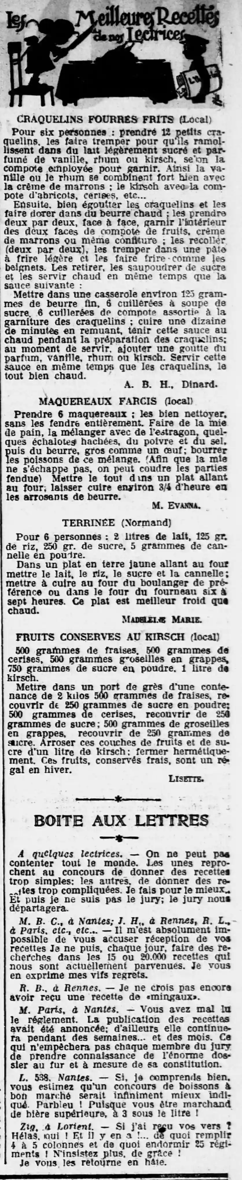 Craquelins fourrés frits (local), maquereaux farcis (local), terrinée (normand) et des fruits conservés au kirsch (local) |