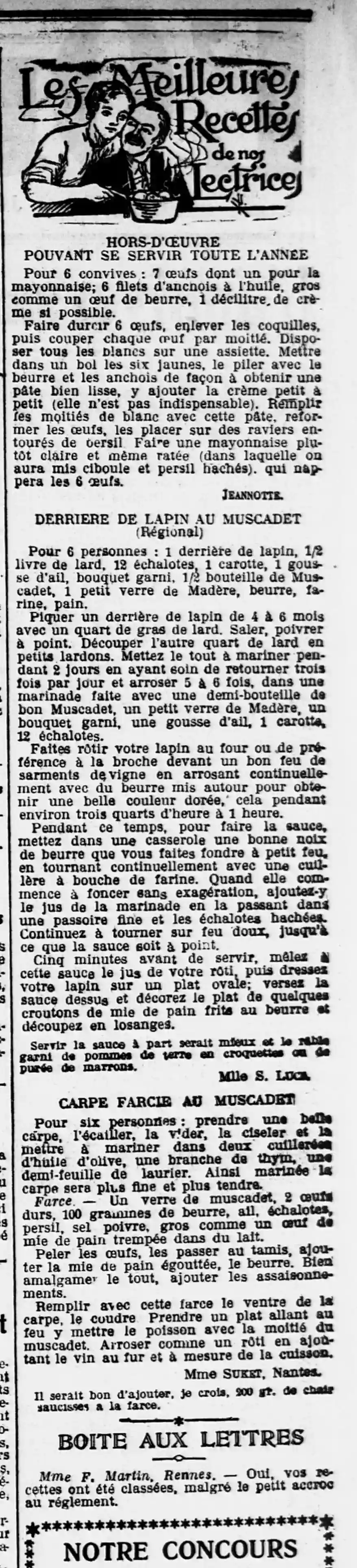 L'Ouest-Éclair - Les meilleures recettesles meilleures recettes de nos lectrices de nos lectrices : hors-d'œuvre pouvant se servir toute l'année (oeufs à la crème d'anchois), derrière de lapin au Muscadet (régional) et carpe farcie au Muscadet