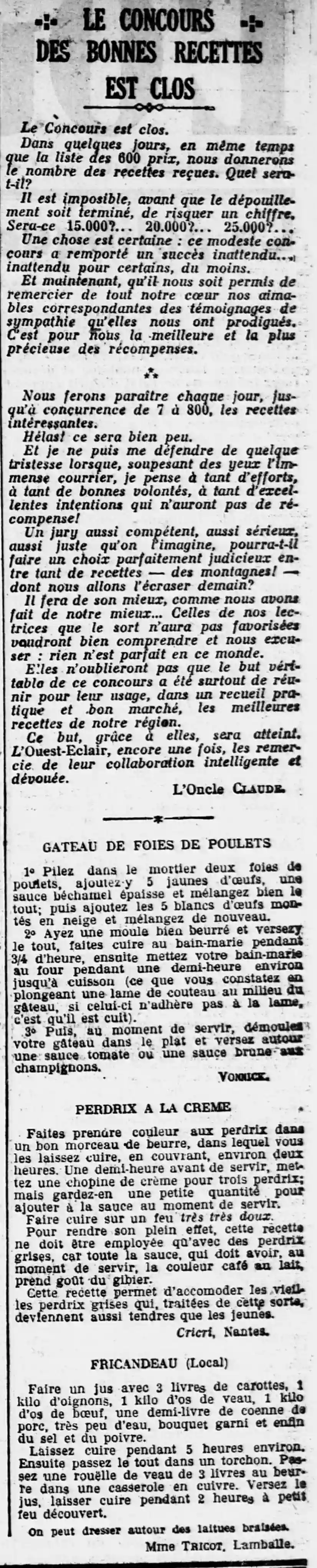 les recettes des lectricesL'Ouest-Éclair - Le concours des bonnes recettes est closles recettes des lectrices, mais bonne nouvelle, la diffusion des recettes continue : 700 à 800 sont annoncées ! Et pour aujourd'hui les recettes d'un gâteau de foie de poulet, perdrix à la crème et frincandeau (local) sont au programme