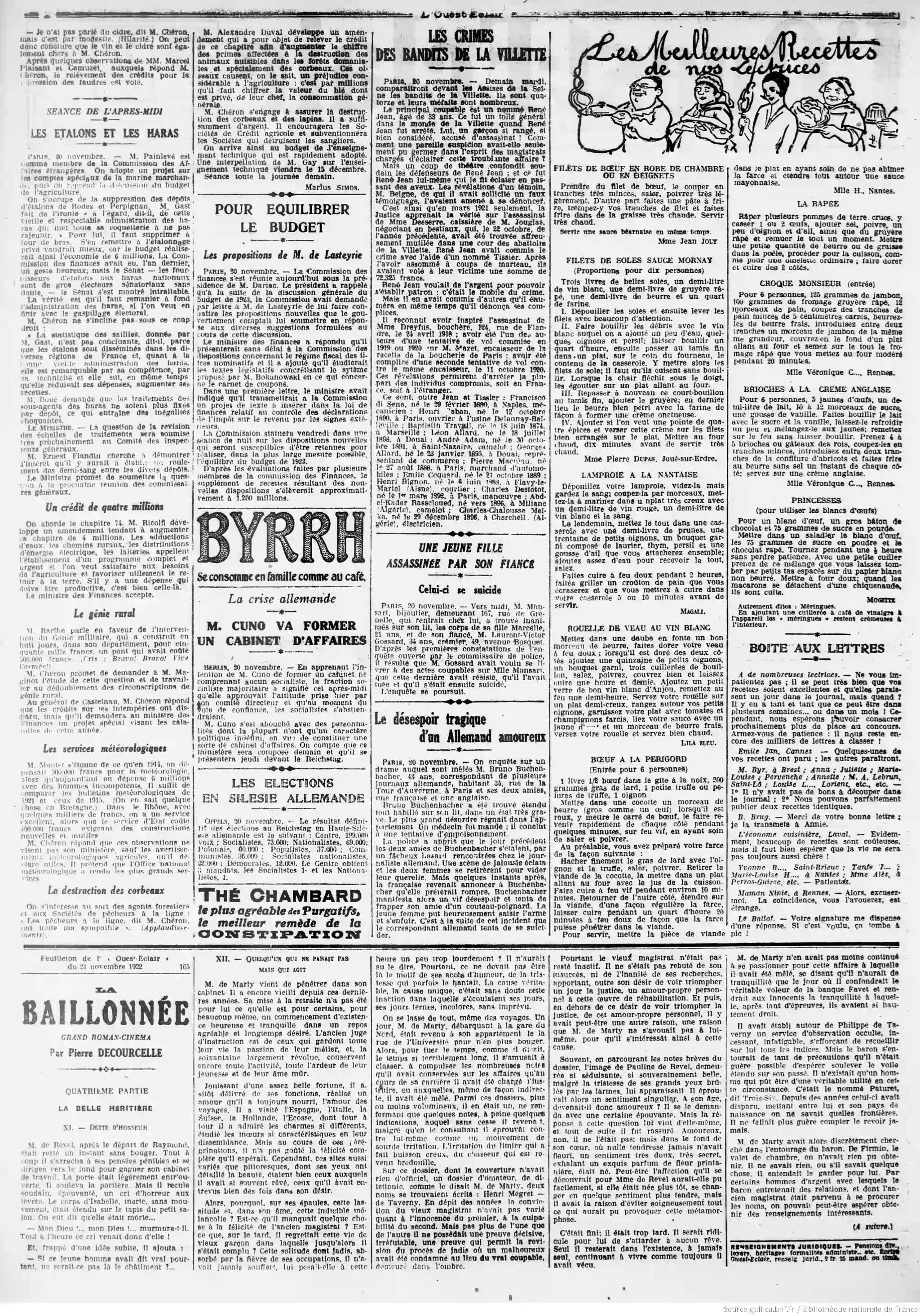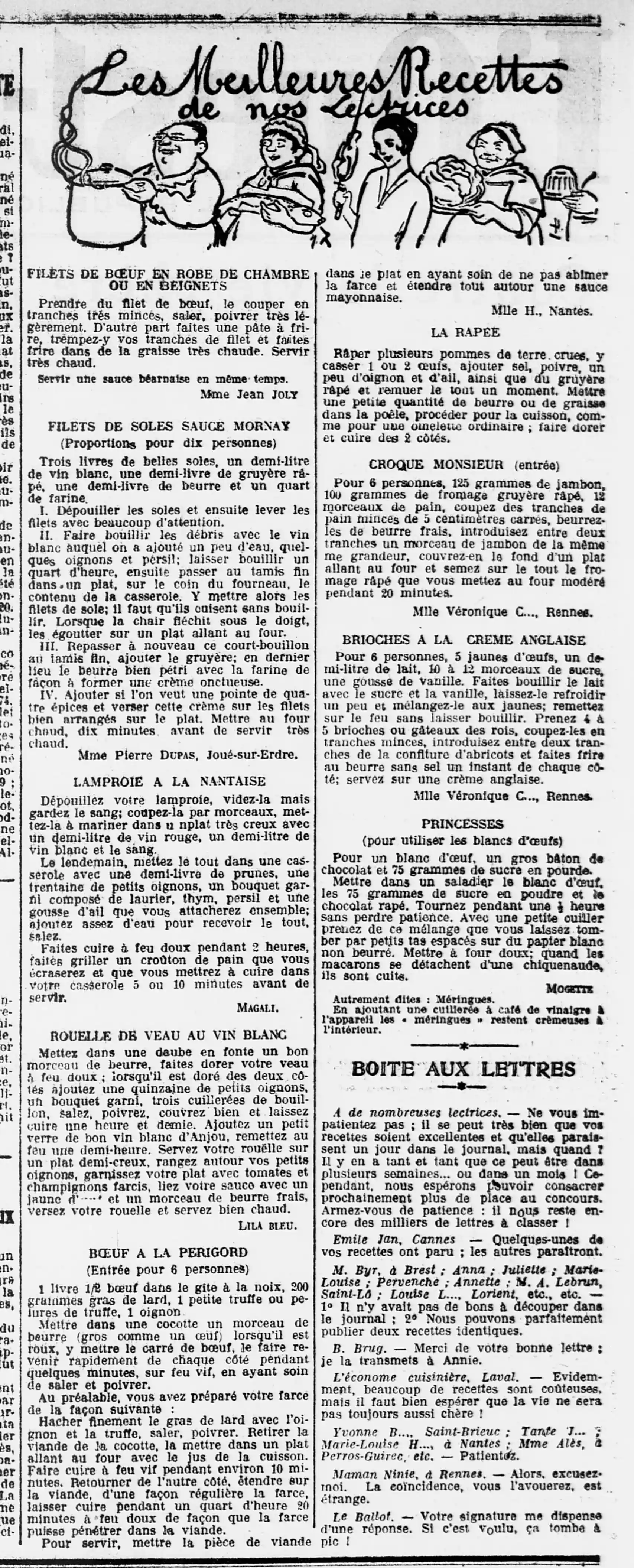 L'Ouest-Éclair - Les meilleurs recettesLes meilleurs recettes de nos lectrices : filets de bœuf en robe de chambre où en beignets, filets de soles sauce Mornay, lamproie à la nantaise, rouelle de veau au vin blanc, bœuf à la Périgord (entrée), la râpée de pommes de terre, croque monsieur, brioches à la crème anglaise et des princesses (meringues) de nos lectrices : filets de bœuf en robe de chambre où en beignets, filets de soles sauce Mornay, lamproie à la nantaise, rouelle de veau au vin blanc, bœuf à la Périgord (entrée), la râpée de pommes de terre, croque monsieur, brioches à la crème anglaise et des princesses (meringues)