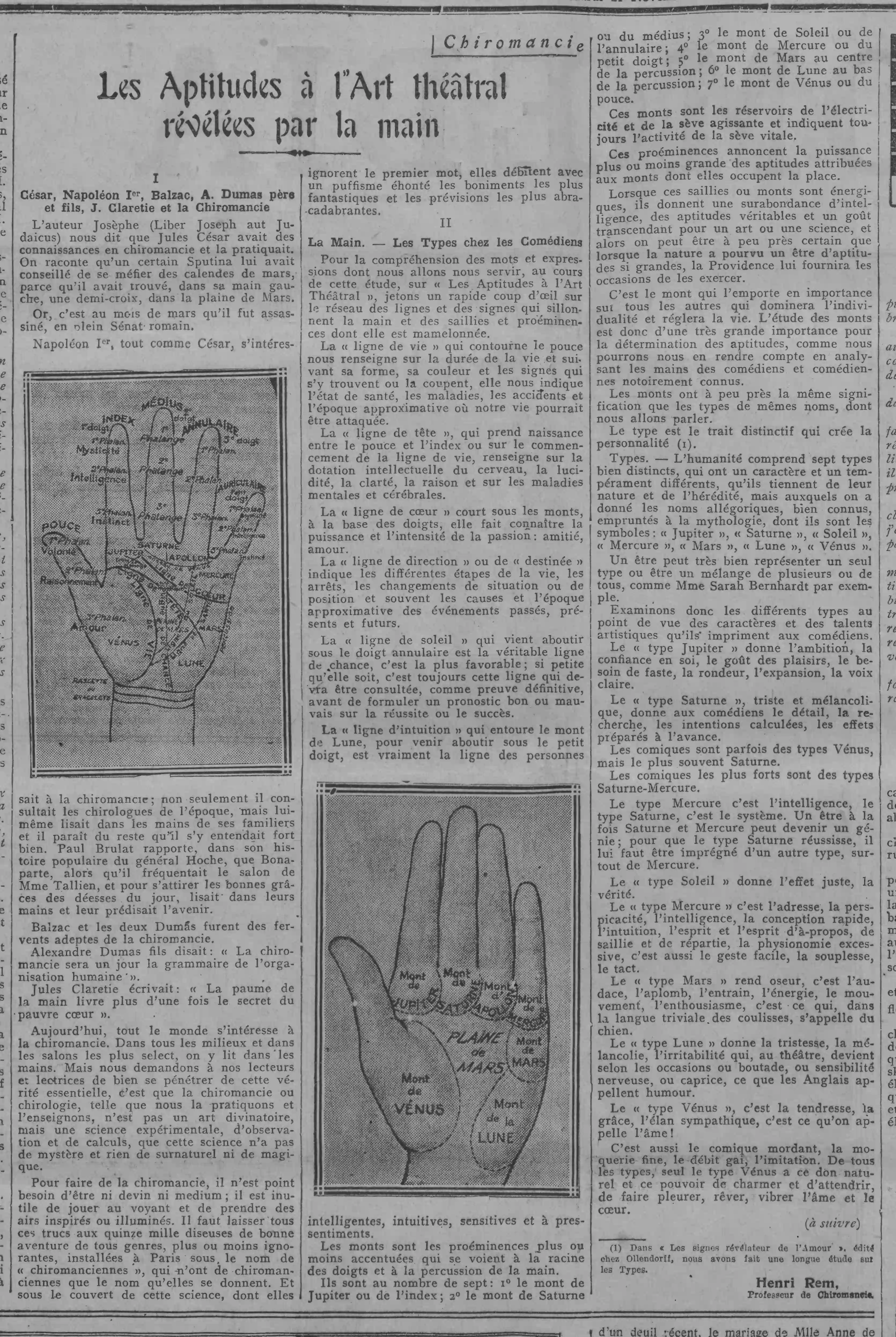 Comoedia - Chiromancie, les aptitudes à l'art théâtralChiromancie, les aptitudes à l'art théâtral révélées par la main, à vérifier avec les comédiens d'aujourd'hui révélées par la main, à vérifier avec les comédiens d'aujourd'hui
