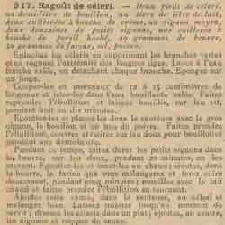 Deux pieds de céleri, un demi-litre de bouillon, un tiers de litre de lait, deux cuillerées à bouche de crème, un oignon moyen, deux douzaines de petits oignons, une cuillerée à bouche de persil haché, 40 grammes de beurre, 30 grammes de farine, sel, poivre.