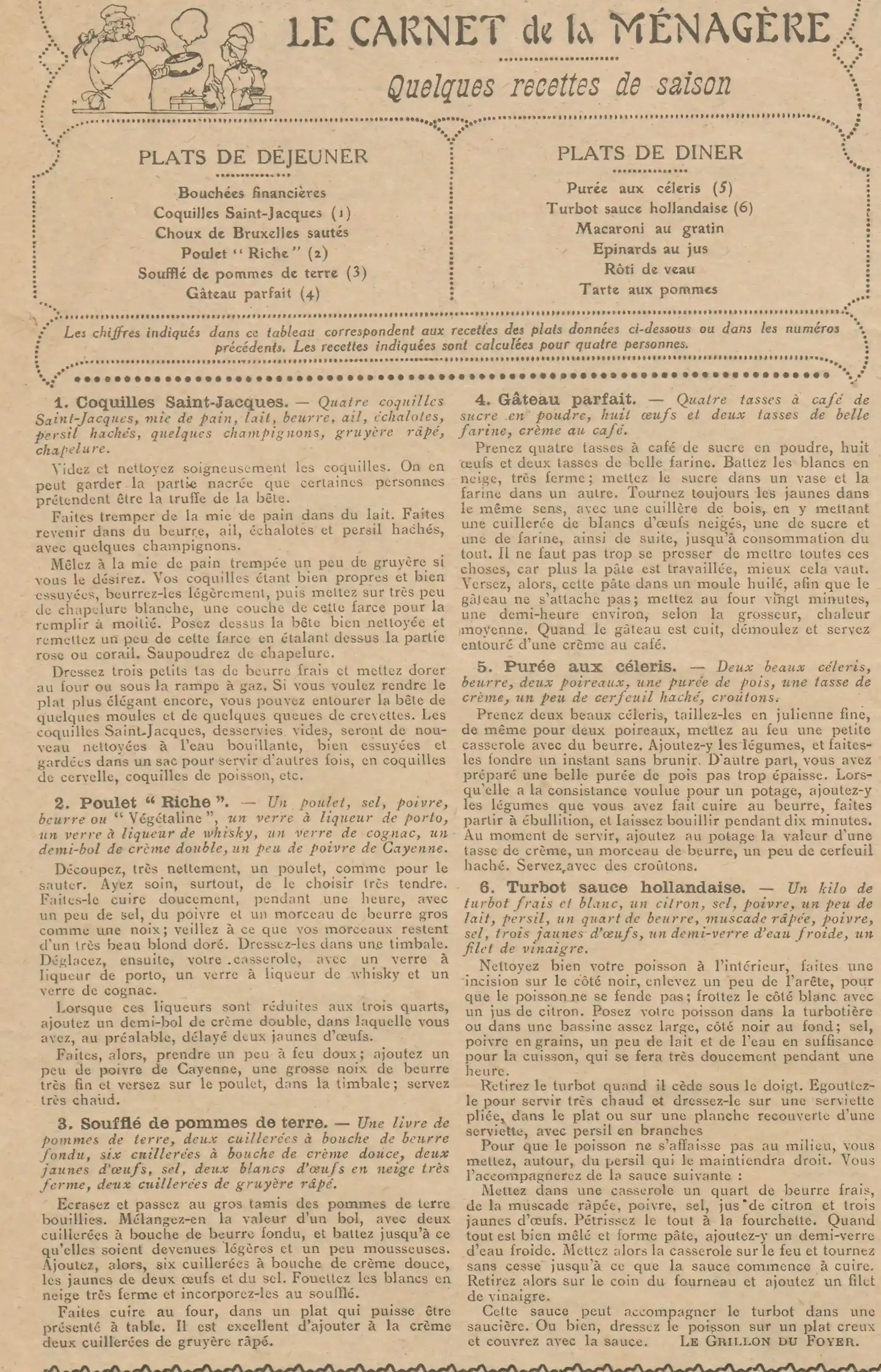 Purée aux céleris (5) Turbot sauce hollandaise (6) Macaroni au gratin Épinards au jus Rôti de veau Tarte aux pommes