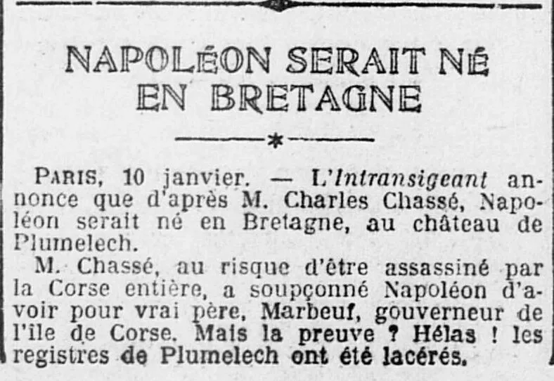 PARIS, 10 janvier. L'Intransigeant annonce que d'après M. Charles Chassé, Napoléon serait né en Bretagne, au château de Plumelech. M. Chassé, au risque d'être assassiné par la Corse entière, a soupçonné Napoléon d'avoir pour vrai père, Marbeuf, gouverneur de l'ile de Corse. Mais la preuve ? Hélas ! les registres de Plumelech ont été lacérés.