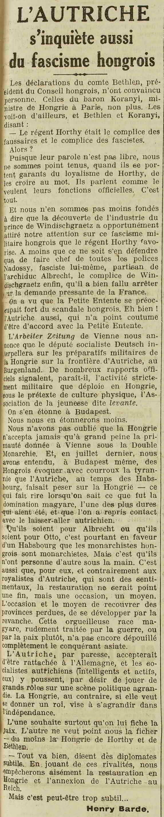 Et nous n'en sommes pas moins fondés à dire que la découverte de l'industrie du prince de Windisch-Graetz a opportunément attiré notre attention sur ce fascisme militaire hongrois que le régent Horthy favorise. A moins que ce ne soit s'en défendre que de faire chef de toutes les polices Nadossy, fasciste lui-même, partisan de l'archiduc Albrecht, le complice de Windischgraetz enfin, qu'il a bien fallu arrêter à la demande pressante de la France.