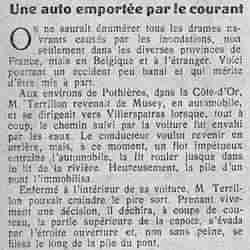 Aux environs de Pothières, dans la Côte-d'Or, M. Terrillon revenait de Musey, en automobile, et se dirigeait vers Villerspatras lorsque, tout à coup, le chemin suivi par la voiture fut envahi par les eaux. Le conducteur voulut revenir en arrière, mais, à ce moment, un flot impétueux entraîna l'automobile, la fit rouler jusque dans le lit de la rivière. Heureusement, la pile d'un pont l'immobilisa.
