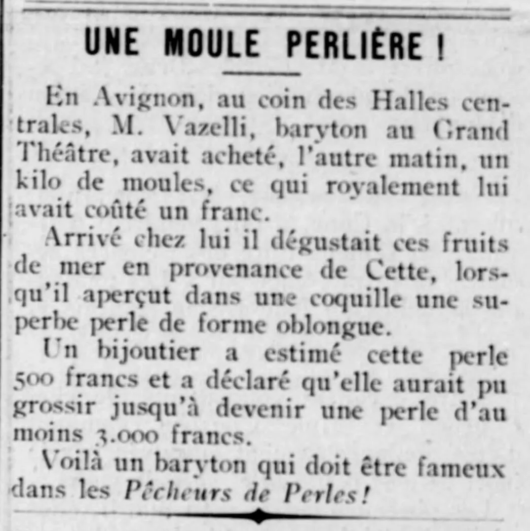 A PEARL MUSSEL! In Avignon, at the corner of the Halles Centrales, Mr. Vazelli, a baritone at the Grand Théâtre, had bought a kilo of mussels the other morning, which had cost him a royal franc. |