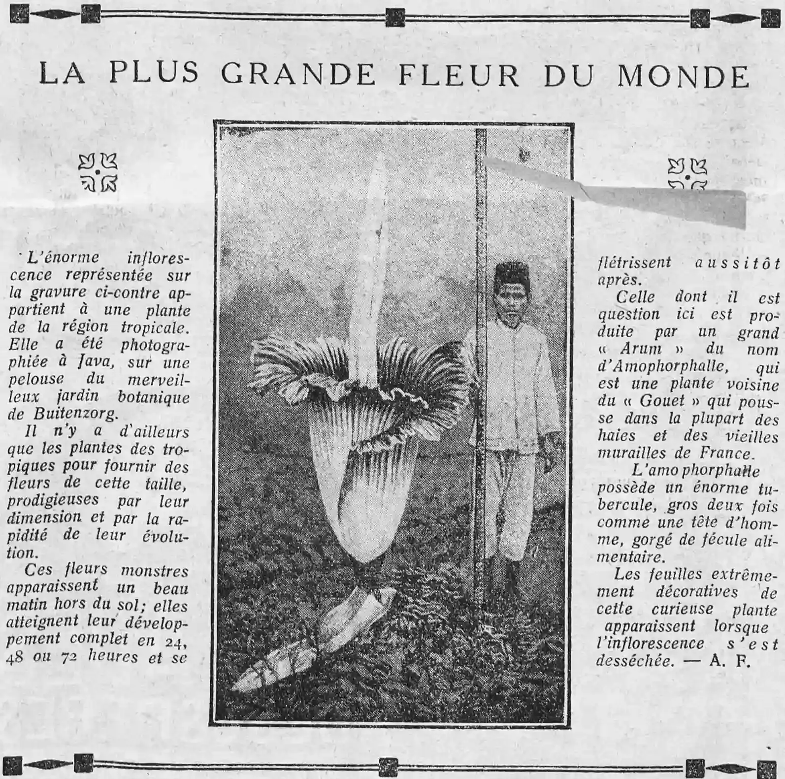 The largest flower in the world The enormous inflorescence represented in the engraving opposite belongs to a plant from the tropical region. It was photographed in Java, on a lawn in the wonderful botanical garden of Buitenzorg. In fact, only tropical plants can provide flowers of this size, prodigious in their size and the speed of their development. These monster flowers appear one fine morning out of the ground; they reach their full development in 24, 48 or 72 hours and wither immediately afterwards. The one in question here is produced by a large "Arum" called Amophorphalle, which is a plant related to the "Gouet" that grows in most hedges and old walls in France. The amophorphalle has an enormous tuber, twice the size of a man's head, full of food starch. The extremely decorative leaves of this curious plant appear when the inflorescence has dried up. A. F.