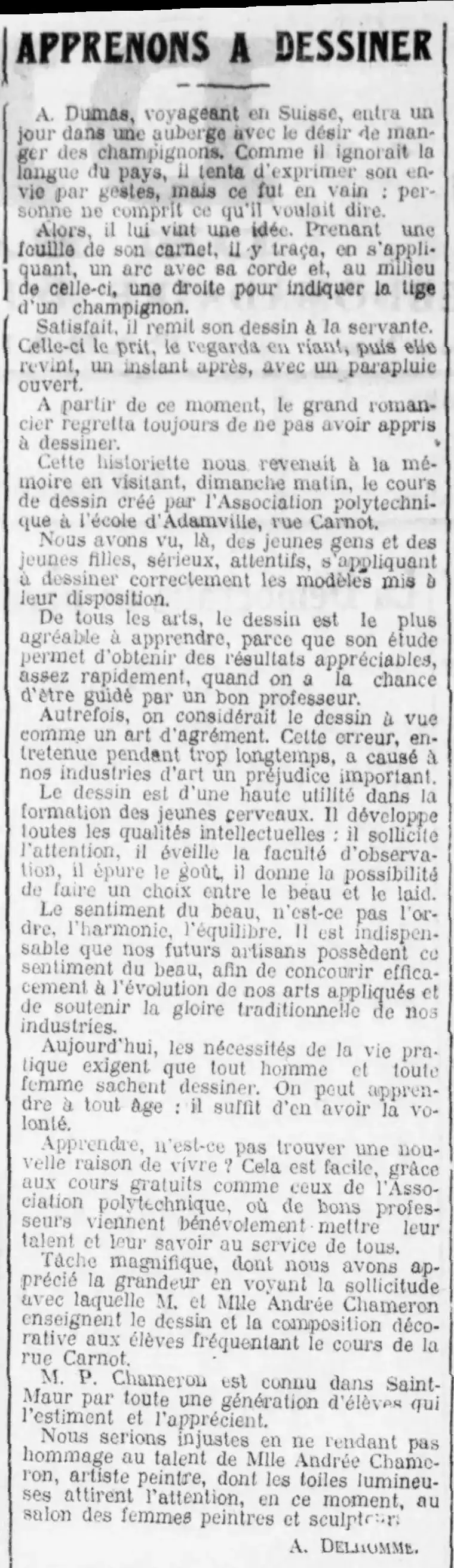 A. Dumas, voyageant en Suisse, entra un jour dans une auberge avec le désir de manger des champignons. Comme il ignorait la langue du pays, il tenta d'exprimer son envie par gestes, mais ce fut en vain : personne ne comprit ce qu'il voulait dire. Alors, il lui vint une idée. Prenant une feuille de son carnet, il y traça, en s'appliquant, un arc avec sa corde et, au milieu de celle-ci, une droite pour indiquer la tige d'un champignon. Satisfait, il remit son dessin à la servante. Celle-ci le prit, le regarda en riant, puis elle revint, un instant après, avec un parapluie ouvert. A partir de ce moment, le grand romancier regretta toujours de ne pas avoir appris à dessiner. Cette historiette nous revenait à la mémoire en visitant, dimanche matin, le cours de dessin créé par l'Association polytechnique à l'école d'Adamville, rue Carnot. Nous avons vu, là, des jeunes gens et des jeunes filles, sérieux, attentifs, s'appliquant à dessiner correctement les modèles mis à leur disposition. De tous les arts, le dessin est le plus agréable à apprendre, parce que son étude permet d'obtenir des résultats appréciables, assez rapidement, quand on a la chance d'être guidé par un bon professeur. Autrefois, on considérait le dessin à vue comme un art d'agrément. Cette erreur, entretenue pendant trop longtemps, a causé à nos industries d'art un préjudice important. Le dessin est d'une haute utilité dans la formation des jeunes cerveaux. Il développe toutes les qualités intellectuelles : il sollicite l'attention, il éveille la faculté d'observation, il épure le goût, il donne la possibilité de faire un choix entre le beau et le laid. Le sentiment du beau, n'est-ce pas l'ordre, l'harmonie, l'équilibre. Il est indispensable que nos futurs artisans possèdent ce sentiment du beau, afin de concourir efficacement à l'évolution de nos arts appliqués et de soutenir la gloire traditionnelle de nos industries. Aujourd'hui, les nécessités de la vie pratique exigent que tout homme et toute femme sachent dessiner. On peut apprendre à tout âge : il suffit d'en avoir là volonté. Apprendre, n'est-ce pas trouver une nouvelle raison de vivre ? Cela est facile, grâce aux cours gratuits comme ceux de l'Association polytechnique, où de bons professeurs viennent bénévolement mettre leur talent et leur savoir au service de tous. Tâche magnifique, dont nous avons apprécié la grandeur en voyant la sollicitude avec laquelle M. et Mlle Andrée Chameron enseignent le dessin et la composition décorative aux élèves fréquentant le cours de la rue Carnot. M. P. Chameron est connu dans Saint-Maur par toute une génération d'élèves qui l'estiment et l'apprécient. Nous serions injustes en ne rendant pas hommage au talent de Mlle Andrée Chameron, artiste peintre, dont les toiles lumineuses attirent l'attention, en ce moment, au salon des femmes peintres et sculpteur