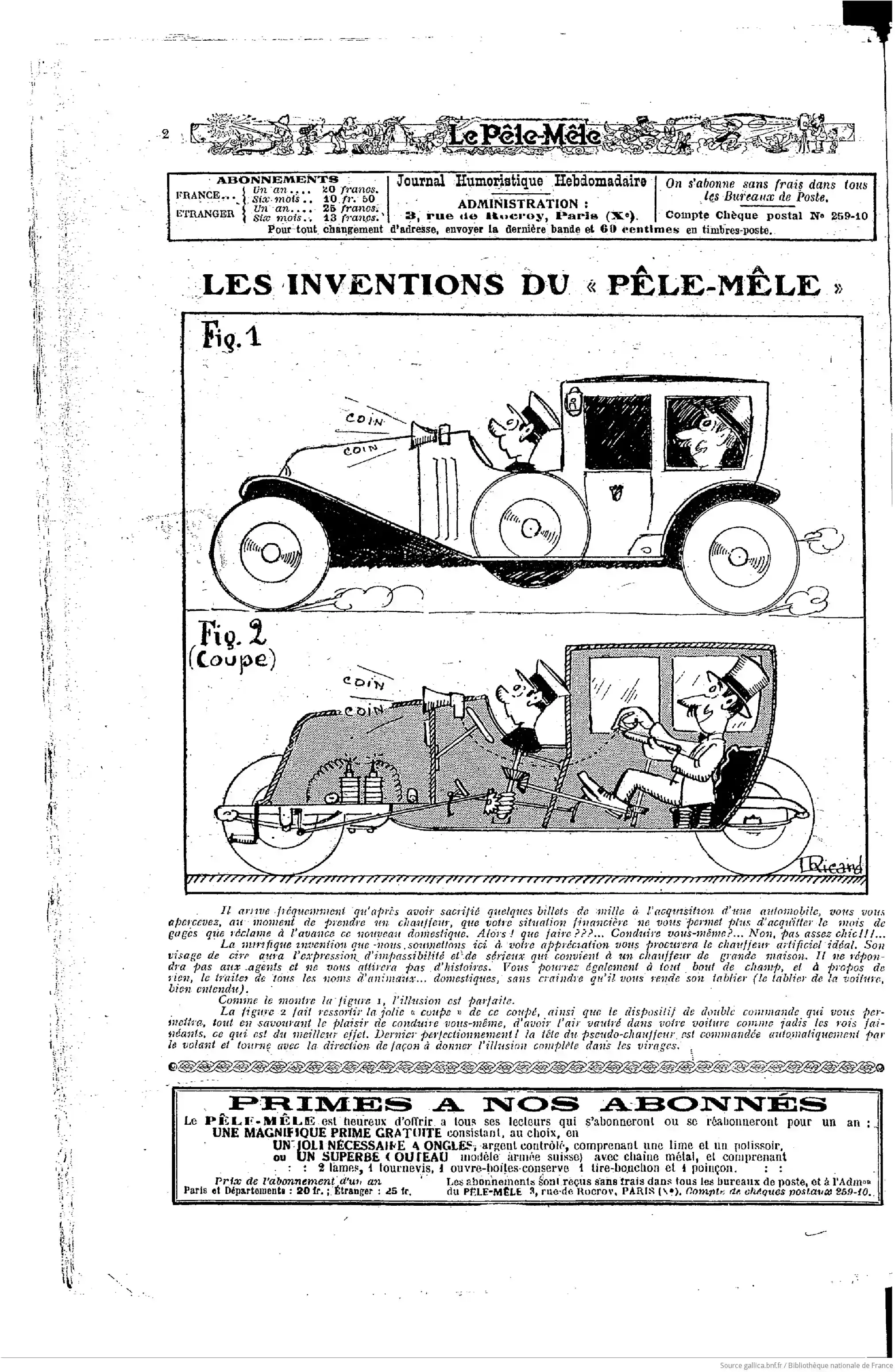 La mirifique invention que nous, soumettons ici à votre appréciation vous procurera le chauffeur artificiel idéal. Son visage de cire aura l'expression d'impassibilité et de sérieux qui convient à un chauffeur de grande maison. Il ne répondra pas aux agents et ne vous attirera pas d'histoires. Vous pourrez également à tout bout de champ, et à propos de rien, le traiter de tous les noms d'animaux... domestiques, sans craindre qu'il vous rende son tablier (le tablier de la voiture, bien entendu).