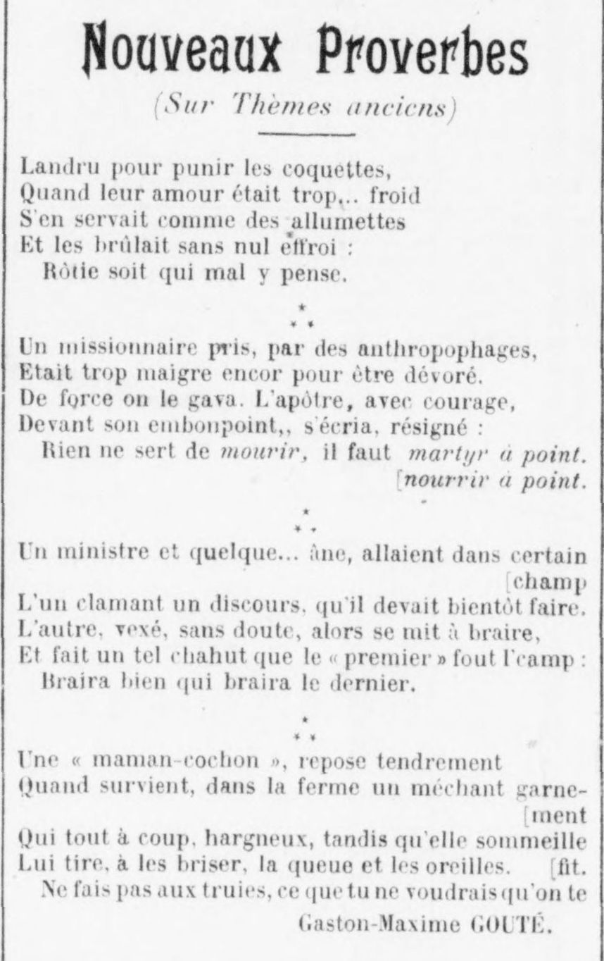 New Proverbs Landru to punish coquettes, A missionary taken, by cannibals, A minister and some... donkey, were going to a certain field A "mother pig" rests tenderly Gaston-Maxime GOUTÉ.