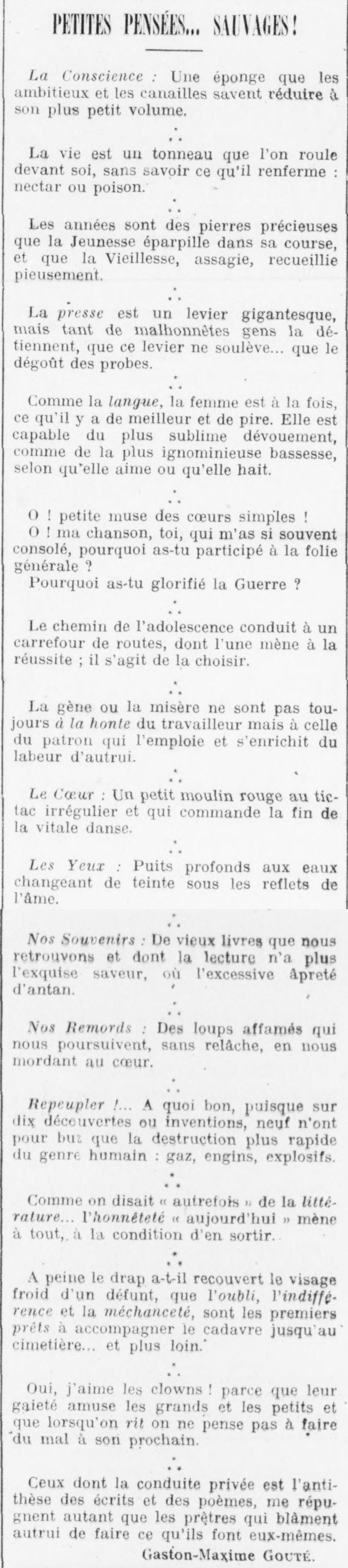 SMALL THOUGHTS... WILD! Conscience: A sponge that the ambitious and the scoundrels know how to reduce to its smallest volume. Life is a barrel that one rolls before oneself, without knowing what it contains: nectar or poison." The years are precious stones that Youth scatters in its course, and that Old Age, tamed, piously collected. The press is a gigantic lever, but so many dishonest people hold it, that this lever raises... only the disgust of the honest. Like the tongue, woman is at once the best and the worst. She is capable of the most sublime devotion, as of the most ignominious baseness, according to whether she loves or hates. O! little muse of simple hearts! O! my song, you, who have so often consoled me, why have you participated in the general madness? Why have you glorified War? The path of adolescence leads to a crossroads of roads, one of which leads to success; it is a question of choosing it. Embarrassment or misery is not always to the shame of the worker but to that of the boss who employs him and enriches himself from the labor of others. The Heart: A small red mill with an irregular ticking that commands the end of the vital dance. The Eyes: Deep wells with waters changing color under the reflections of the soul. Our Memories: Old books that we find and whose reading no longer has the exquisite flavor, or the excessive harshness of yesteryear. Our Remorse: Hungry wolves that pursue us, relentlessly, biting our hearts. Repopulate! ... What's the point, since out of ten discoveries or inventions, nine have no other goal than the more rapid destruction of the human race gas, engines, explosives. As they used to say "in the past" about literature... honesty "today" leads to everything, on condition that you get out of it... As soon as the sheet has covered the cold face of a deceased person, oblivion, indifference and wickedness are the first ready to accompany the corpse to the cemetery... and further, Yes, I like clowns! because their gaiety amuses young and old and when we laugh we do not think of harming our neighbor. Those whose private conduct is the antithesis of writings and poems, disgust me as much as the priests who blame others for doing what they themselves do. Gaston-Maxime GOUTÉ.