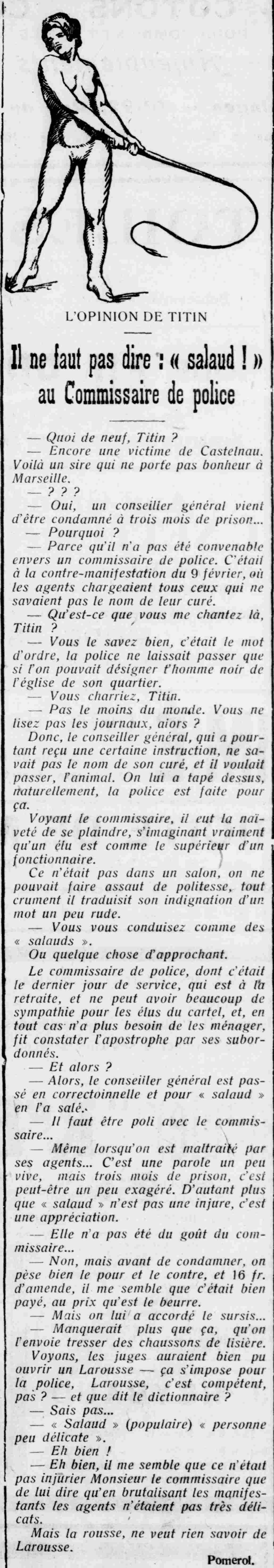 — What's new, Titin? — Another victim from Castelnau. There's a man who doesn't bring good luck to Marseille. — ??? — Yes, a county councilor has just been sentenced to three months in prison... — Why? — Because he wasn't proper towards a police commissioner. It was at the counter-demonstration on February 9, where the officers charged anyone who didn't know the name of their priest. — What are you talking about, Titin? — You know very well, that was the order, the police would only let you pass if you could point out the black man from the church in your neighborhood. — You were kidding, Titin. — Not in the least. So you don't read the newspapers? So, the general councillor, who had nevertheless received some education, did not know the name of his priest, and he wanted to get through, the animal. He was beaten up, naturally, the police are made for that. Seeing the commissioner, he was naive enough to complain, really imagining that an elected official is like the superior of a civil servant. It was not in a salon, one could not make an assault on politeness, quite bluntly he expressed his indignation in a rather harsh word. You behave like "bastards" Or something like that. The police commissioner, whose last day of service it was, who is retired, and cannot have much sympathy for the elected officials of the cartel, and, in any case, no longer needs to spare them, had the apostrophe noted by his subordinates. — So what? — So, the general councillor was sent to correctional court and for "bastard" he was salted. You have to be polite to the commissioner... Even when you're mistreated by his officers... That's a bit of a harsh word, but three months in prison is perhaps a bit of an exaggeration. Especially since "bastard" is not an insult, it's an assessment. — It didn't please the commissioner... — No, but before sentencing, you weigh up the pros and cons, and a 16 franc fine, I think it was well paid, at the price of butter. — But he was granted a suspended sentence... — All that's missing is for him to be sent to weave selvedge slippers. — Come on, the judges could have opened a Larousse, it's a must for the police, — Larousse is competent, isn't it? — And what does the dictionary say? — I don't know... Pomerol.