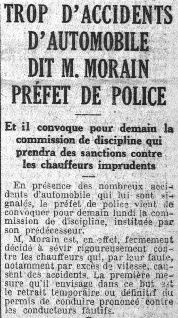 TROP D'ACCIDENTS D'AUTOMOBILE DIT M. MORAIN PRÉFET DE POLICE Et il convoque pour demain la commission de discipline qui prendra des sanctions contre les chauffeurs imprudents