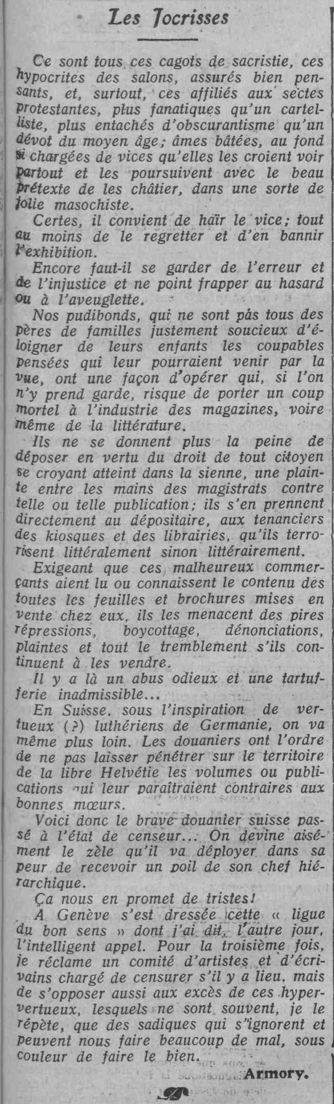 A Genève s'est dressée cette «ligue du bon sens» dont j'ai dit, l'autre jour, l'intelligent appel. Pour la troisième fois, je réclame un comité d'artistes et d'écrivains chargé de censurer s'il y a lieu. mais de s'opposer aussi aux excès de ces hyper-vertueux, lesquels ne sont souvent, je le répète, que des sadiques qui s'ignorent et peuvent nous faire beaucoup de mal, sous couleur de faire le bien.