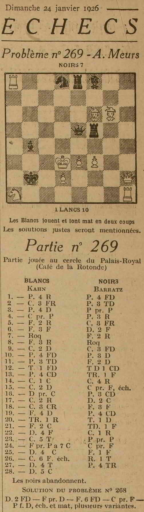 La Partie d'échecs n°269, jouée entre Victor Kahni et Abrham Baratz - 24 janvier 1926