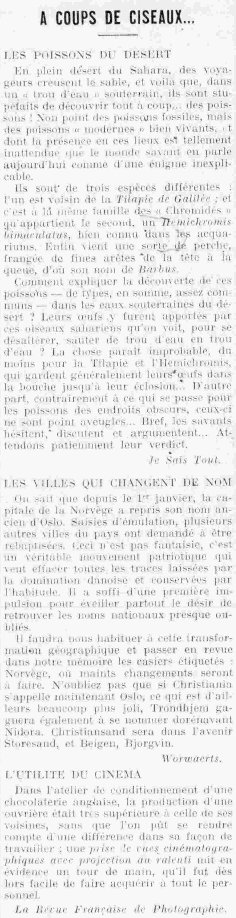 We know that since January 1st, the capital of Norway has reverted to its former name of Oslo. Seized by emulation, several other cities in the country have asked to be renamed. This is not a fantasy; it is a genuine patriotic movement that aims to erase all traces left by Danish domination and preserved by custom. It only took one initial impulse to awaken everywhere the desire to rediscover almost forgotten national names. We will have to get used to this geographical transformation and review in our minds the boxes labeled Norway, where many changes will have to be made. Remember that if Christiania is now called Oslo, which is much prettier, Trondhjem will also benefit from being called Nidora from now on. Christiansand will in the future be Storesand, and Beigen, Bjorgvin.