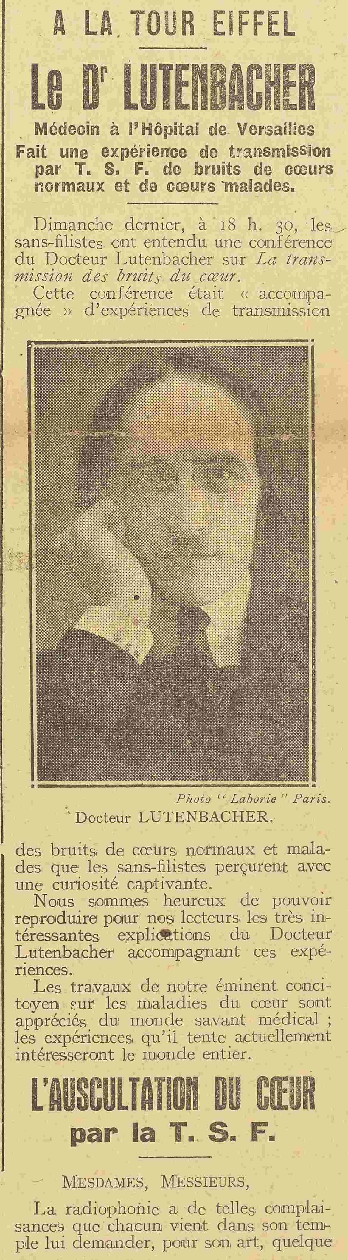 Le D' LUTENBACHER Médecin à l'Hôpital de Versailles fait une expérience de transmission par T. S. F. de bruits de cœurs normaux et de cœurs malades.