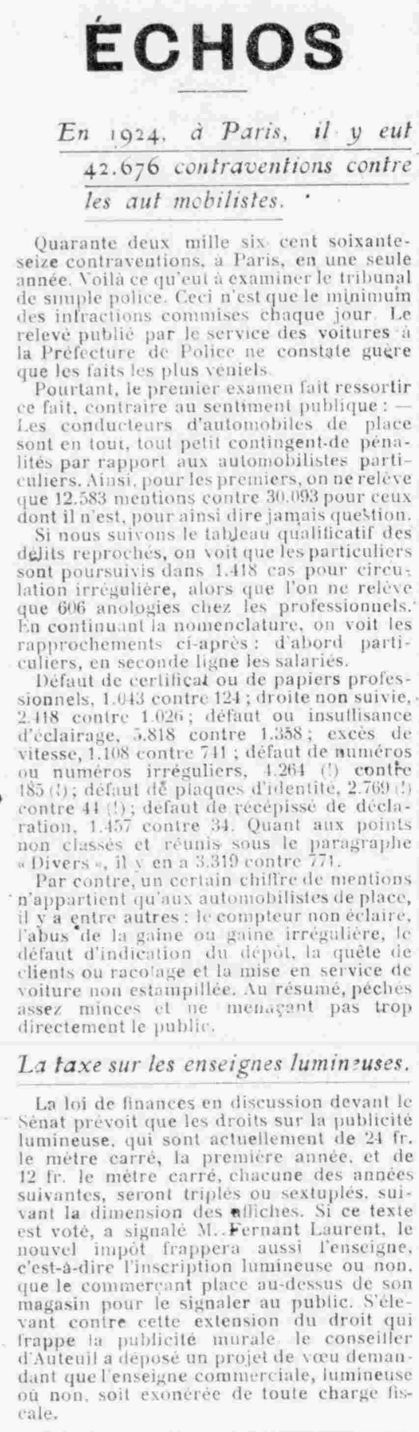 En 1924, à Paris, il y eut 42.676 contraventions contre les automobilistes. Quarante deux mille six cent soixante-seize contraventions, à Paris, en une seule année. Voilà ce qu'eut à examiner le tribunal de simple police. Ceci n'est que le minimum des infractions commises chaque jour. Le relevé publié par le service des voitures à la Préfecture de Police ne constate guère que les faits les plus véniels Pourtant, le premier examen fait ressortir ce fait, contraire au sentiment public: - Les conducteurs d'automobiles de place sont en tour, tout petit contingent-de pénalités par rapport aux automobilistes particuliers. Ainsi, pour les premiers, on ne relève que 12.583 mentions contre 30.093 pour ceux dont il n'est, pour ainsi dire jamais question. Si nous suivons le tableau qualificatif des délits reprochés, on voit que les particuliers sont poursuivis dans 1.418 cas pour circulation irrégulière, alors que l'on ne relève que 606 analogies chez les professionnels. En continuant la nomenclature, on voit les rapprochements ci-après: d'abord particuliers, en seconde ligne les salariés. Défaut de certificat ou de papiers professionnels, 1.043 contre 121; droite non suivie, 2.118 contre 1.026; défaut ou insuffisance d'éclairage, 5.818 contre 1.358; excès de vitesse, 1.108 contre 741; défaut de numéros ou numéros irréguliers, 4.264 contre 185, défaut de plaques d’identité, 2.769 contre 41 (!); défaut de récépissé de déclaration, 1.457 contre 34. Quant aux points non classés et réunis sous le paragraphe « Divers, il y en a 3.319 contre 771. Par contre, un certain chiffre de mentions n'appartient qu'aux automobilistes de place, il y a entre autres: le compteur non éclairé, l'abus de la gaine ou gaine irrégulière, le défaut d'indication du dépôt, la quête de clients ou racolage et la mise en service de voiture non estampillée. Au résumé, péchés assez minces et ne menaçant pas trop directement le public. La taxe sur les enseignes lumineuses. La loi de finances en discussion devant le Sénat prévoit que les droits sur la publicité lumineuse, qui sont actuellement de 24 fr. le mètre carré, la première année, et de 12 fr. le mètre carré, chacune des années suivantes, seront triplés ou sextuplés, suivant la dimension des affiches. Si ce texte est voté, a signalé M. Fernand Laurent, le nouvel impôt frappera aussi l'enseigne, c'est-à-dire l'inscription, lumineuse ou non, que le commerçant place au-dessus de son magasin pour le signaler au public. S'élevant contre cette extension du droit qui frappe la publicité murale le conseiller d'Auteuil a déposé un projet de vœu demandant que l'enseigne commerciale, lumineuse où non, soit exonérée de toute charge fiscale. |