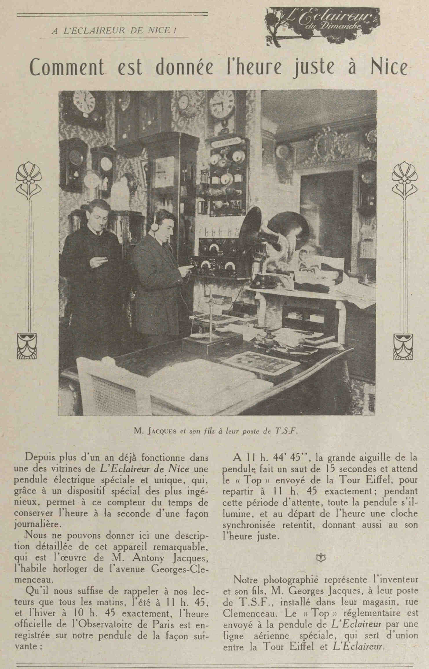 Depuis plus d'un an déjà fonctionne, dans une des vitrines de L’Éclaireur de Nice, une pendule électrique spéciale et unique, qui, grâce à un dispositif spécial des plus ingénieux, permet à ce compteur du temps de conserver l'heure à la seconde d'une façon journalière. Nous ne pouvons donner ici une description détaillée de cet appareil remarquable, qui est l'œuvre de M. Antony Jacques, l'habile horloger de l'avenue Georges-Clemenceau. Qu'il nous suffise de rappeler à nos lecteurs que tous les matins, l'été à 11 h. 45, et l'hiver à 10 h. 45 exactement, l'heure officielle de l'Observatoire de Paris est enregistrée sur notre pendule de la façon suivante : A 11 h. 44' 45", la grande aiguille de la pendule fait un saut de 15 secondes et attend le « Top» envoyé de la Tour Eiffel, pour repartir à 11 h 45 exactement; pendant cette période d'attente, toute la pendule s'illumine, et au départ de l'heure une cloche synchronisée retentit, donnant aussi au son l'heure juste. Notre photographie représente l'inventeur et son fils, M. Georges Jacques, à l’écoute du poste de T.S.F. installé dans leur magasin, rue Clemenceau. Le «Top» réglementaire est envoyé à la pendule de L’Éclaireur par une ligne aérienne spéciale, qui sert d'union entre la Tour Eiffel et L’Éclaireur de Nice. Et un siècle plus tard : Allouis : l'émetteur reste le maître des horloges, il continuera d'émettre l'heure légale en France pour dix ans. Pas moins de 200.000 récepteurs en France sont synchronisés sur cette heure légale. Cela concerne les transports, trains et avions, mais aussi le déclenchement de l'éclairage public ou même l'heure sur les horodateurs.