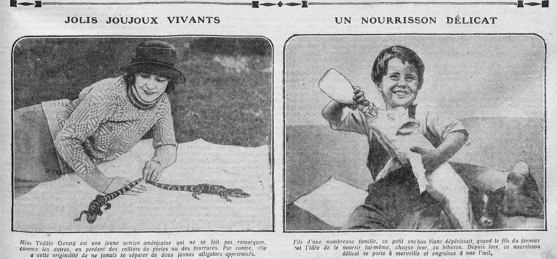 Miss Teddie Gerard est une jeune actrice américaine qui ne se fait pas remarquer comme les autres, en perdant des colliers de perles ou des fourrures. Par contre, elle a cette originalité de ne jamais se séparer de deux jeunes alligators apprivoisés. Fils d'une nombreuse famille, ce petit cochon blanc dépérissait, quand le fils du fermier eut l'idée de le nourrir lui-même, chaque jour, au biberon. Depuis lors, ce nourrisson délicat se porte à merveille et engraisse à vue l'œil. |