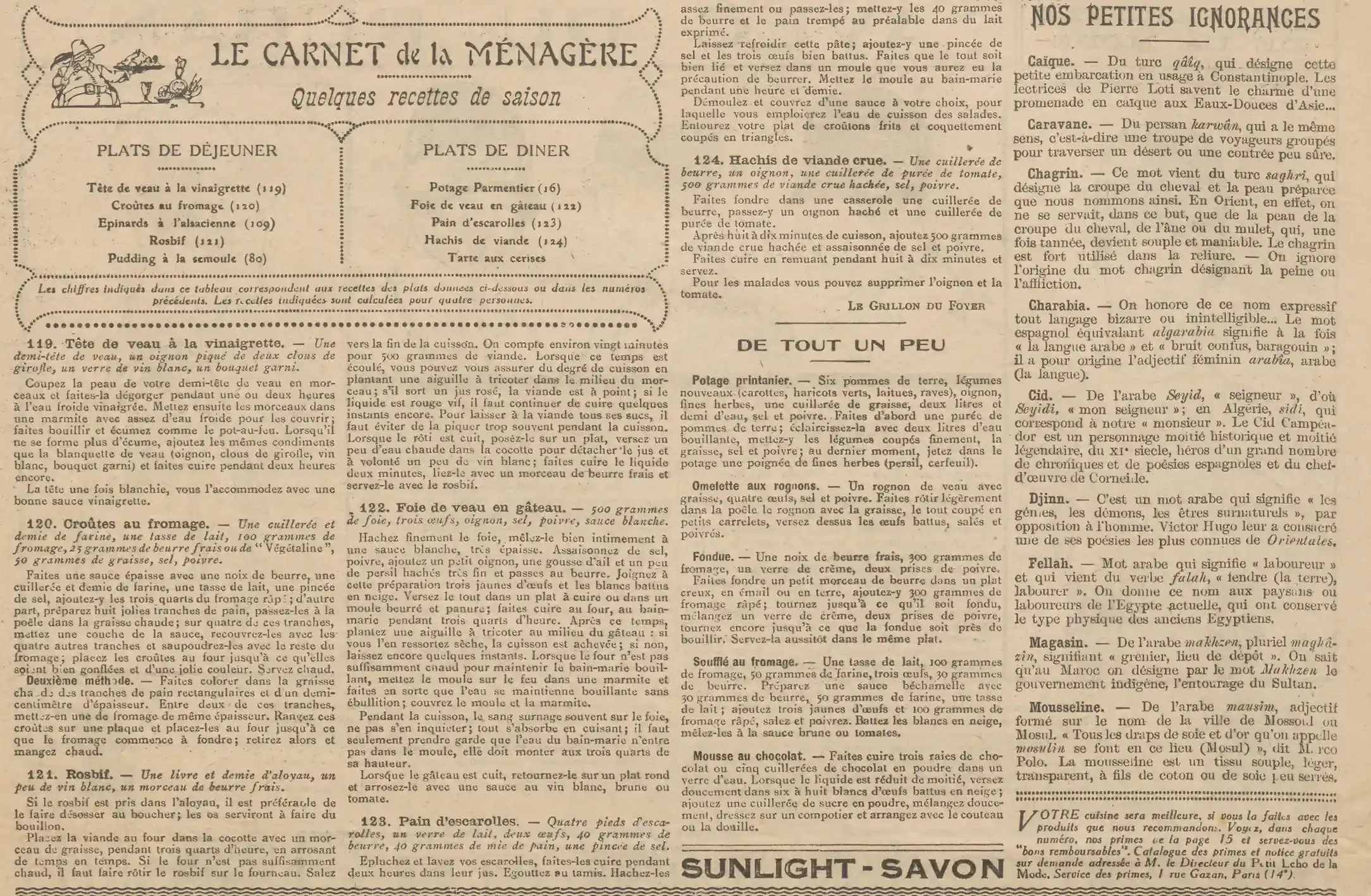 119. Calf's Head with Vinaigrette. Half a calf's head, one onion studded with two cloves, one glass of white wine, and a bouquet garni. Cut the skin of your half a calf's head into pieces and soak it for one or two hours in cold water with vinegar. Then place the pieces in a pot with enough cold water to cover them; boil and skim off the foam as with the pot-au-feu. When no more foam forms, add the same condiments as with the veal blanquette (onion, cloves, white wine, bouquet garni) and cook for another two hours. Once the head is blanched, serve it with a good vinaigrette sauce.