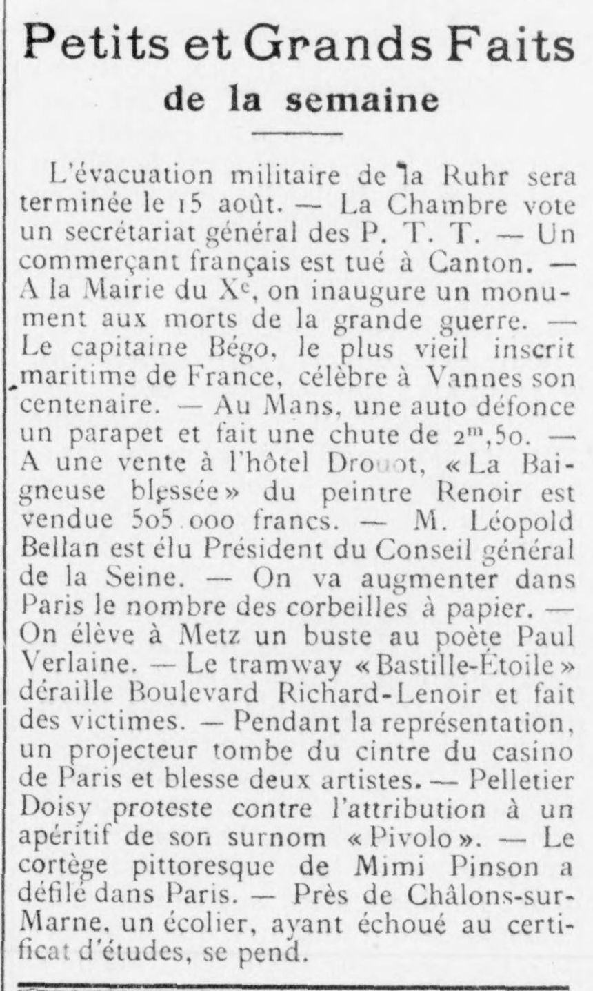 - L'évacuation militaire de la Ruhr sera terminée le 15 août. - La Chambre vote un secrétariat général des P. T. T. - Un commerçant français est tué à Canton. - A la Mairie du Xe, on inaugure un monument aux morts de la grande guerre. - Le capitaine Bégo, le plus vieil inscrit maritime de France, célèbre à Vannes son centenaire. - Au Mans, une auto défonce un parapet et fait une chute de 2m,50. - A une vente à l'hôtel Drouot, «La Baigneuse blessée» du peintre Renoir est vendue 505.000 francs. - M. Léopold Bellan est élu Président du Conseil général de la Seine. - On va augmenter dans Paris le nombre des corbeilles à papier. - On élève à Metz un buste au poète Paul Verlaine. - Le tramway «Bastille-Étoile » déraille Boulevard Richard-Lenoir et fait des victimes. - Pendant la représentation, un projecteur tombe du cintre du casino de Paris et blesse deux artistes. - Pelletier Doisy proteste contre l'attribution à un apéritif de son surnom « Pivolo ». - Le cortège pittoresque de Mimi Pinson a défilé dans Paris. - Près de Châlons-sur-Marne, un écolier, ayant échoué au certificat d'études, se pend.