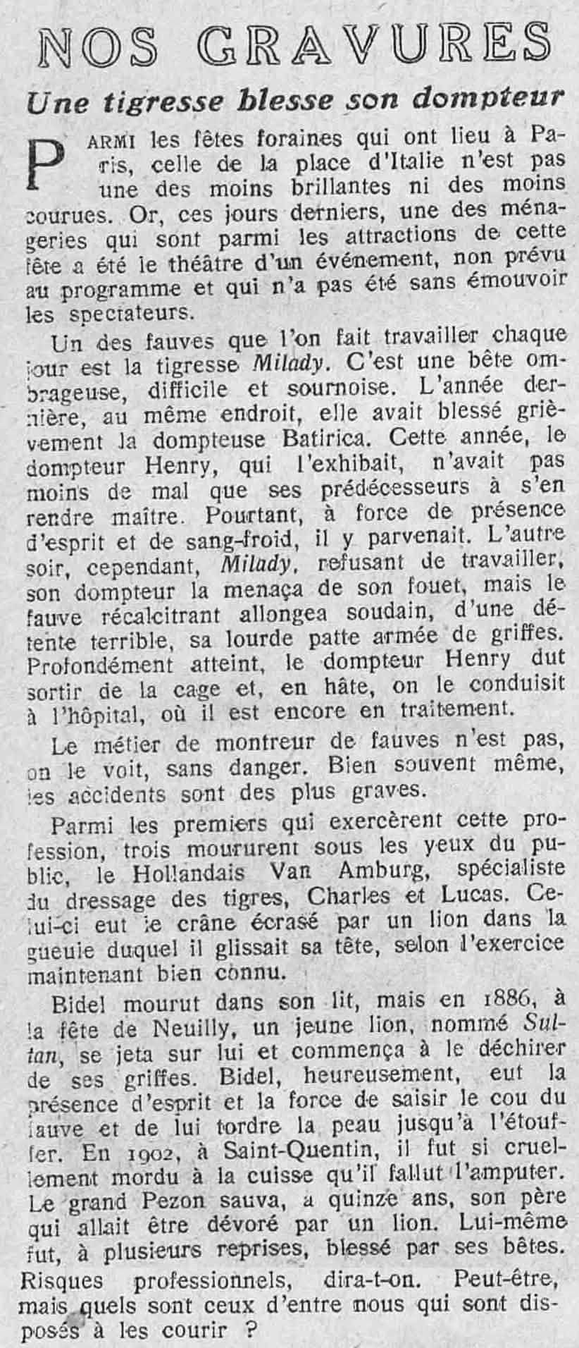Among the funfairs held in Paris, the one on the Place d'Italie is not one of the least dazzling or least popular. However, in recent days, one of the menageries that are among the attractions of this festival was the scene of an event, unscheduled and not without moving spectators. One of the wild animals that is put to work every day is the tigress Milady. She is a touchy, difficult, and sly beast. Last year, at the same location, she seriously injured the tamer Batirica. This year, the tamer Henry, who was exhibiting her, had no less difficulty than his predecessors in controlling her. Yet, with presence of mind and composure, he succeeded. The other evening, however, when Milady refused to work, her tamer threatened her with his whip, but the recalcitrant beast suddenly extended its heavy, clawed paw with a terrible spring. Deeply injured, the tamer Henry had to leave the cage and was hastily taken to the hospital, where he is still receiving treatment. The profession of wild animal trainer is, as we can see, not without danger. Often, accidents are even very serious. Among the first to practice this profession, three died before the public eye: the Dutchman Van Amburg, a specialist in tiger training, Charles, and Lucas. Lucas's skull was crushed by a lion into whose mouth he was slipping his head, according to the now well-known exercise. Bidel died in his bed, but in 1886, at the Neuilly festival, a young lion named Sultan threw himself on him and began to tear him with its claws. Bidel, fortunately, had the presence of mind and the strength to seize the beast's neck and twist its skin until it was suffocated. In 1902, in Saint-Quentin, he was so cruelly bitten on the thigh that it had to be amputated. The great Pezon saved his father, at the age of fifteen, who was about to be devoured by a lion. He himself was injured several times by his beasts. Professional risks, some might say. Perhaps, but which of us are willing to take them?