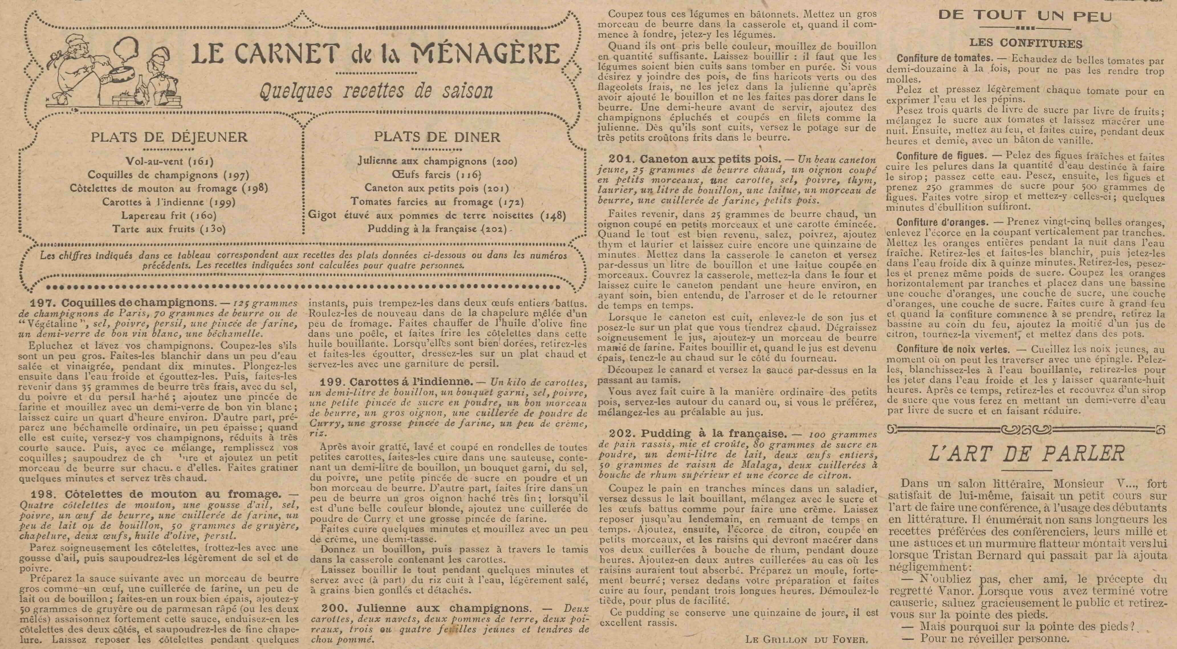 Quand ils ont pris belle couleur, mouillez de bouillon en quantité suffisante. Laissez bouillir: il faut que les légumes soient bien cuits sans tomber en purée. Si vous désirez y joindre des pois, de fins haricots verts ou des flageolets frais, ne les jetez dans la julienne qu'après avoir ajouté le bouillon et ne les faites pas dorer dans le beurre. Une demi-heure avant de servir, ajoutez des champignons épluchés et coupés en filets comme la julienne. Dès qu'ils sont cuits, versez le potage sur de très petits croûtons frits dans le beurre.
