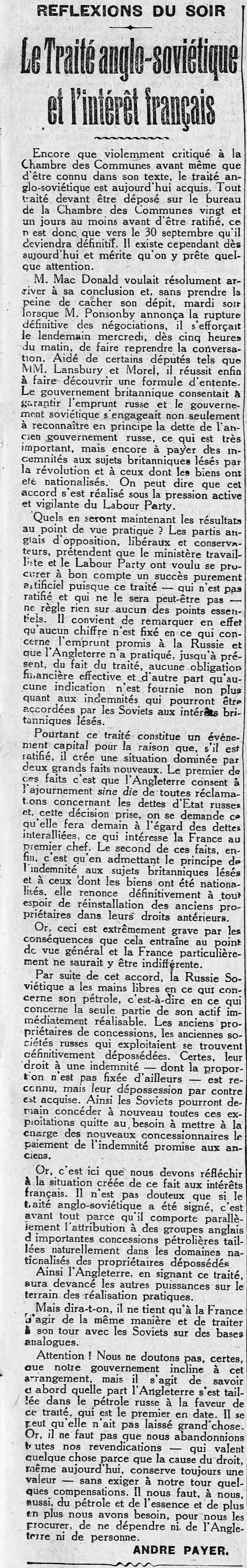 REFLEXIONS DU SOIR Le Traité anglo-soviétique et l'intérêt français Encore que violemment critiqué à la Chambre des Communes avant même que d'être connu dans son texte, le traité anglo-soviétique est aujourd'hui acquis. Tout traité devant être déposé sur le bureau de la Chambre des Communes vingt et un jours au moins avant d'être ratifié, ce n’est donc que vers le 30 septembre qu'il deviendra définitif. Il existe cependant dès aujourd'hui et mérite qu'on y prête quelque attention. M. Mac Donald voulait résolument arriver à sa conclusion et, sans prendre la peine de cacher son dépit, mardi soir lorsque M. Ponsonby annonça la rupture définitive des négociations, il s'efforçait le lendemain mercredi, dès cinq heures du matin, de faire reprendre la conversation. Aidé de certains députés tels que MM. Lansbury et Morel, il réussit enfin à faire découvrir une formule d'entente. Le gouvernement britannique consentait à garantir l'emprunt russe et le gouvernement soviétique s'engageait non seulement à reconnaître en principe la dette de l'ancien gouvernement russe, ce qui est très important, mais encore à payer des indemnités aux sujets britanniques lésés par la révolution et à ceux dont les biens ont été nationalisés. On peut dire que cet accord s'est réalisé sous la pression active et vigilante du Labour Party. Quels en seront maintenant les résultats au point de vue pratique ? Les partis anglais d'opposition, libéraux et conservateurs, prétendent que le ministère travailliste et le Labour Party ont voulu se procurer à bon compte un succès purement artificiel puisque ce traité, qui n'est pas ratifié et qui ne le sera peut-être pas ne règle rien sur aucun des points essentiels. Il convient de remarquer en effet qu'aucun chiffre n'est fixé en ce qui concerne l'emprunt promis à la Russie et que l'Angleterre n'a pratiqué, jusqu'à présent, du fait du traité, aucune obligation financière effective et d'autre part qu'aucune indication n'est fournie non plus quant aux indemnités qui pourront être accordées par les Soviets aux intérêts britanniques lésés. Pourtant ce traité constitue un événement capital pour la raison que, s'il est ratifié, il crée une situation dominée par deux grands faits nouveaux. Le premier de ces faits c'est que l'Angleterre consent à l'ajournement sine die de toutes réclamations concernant les dettes d'Etat russes et cette décision prise, on se demande ce qu'elle fera demain à l'égard des dettes interalliées, ce qui intéresse la France au premier chef. Le second de ces faits, enfin, c'est qu'en admettant le principe de l'indemnité aux sujets britanniques lésés et à ceux dont les biens ont été nationalisés, elle renonce définitivement à tout espoir de réinstallation des anciens propriétaires dans leurs droits antérieurs. Or, ceci est extrêmement grave par les conséquences que cela entraîne au point de vue général et la France particulièrement ne saurait y être indifférente. Par suite de cet accord, la Russie Soviétique a les mains libres en ce qui concerne son pétrole, c'est-à-dire en ce qui concerne la seule partie de son actif immédiatement réalisable. Les anciens propriétaires de concessions, les anciennes sociétés russes qui exploitaient se trouvent définitivement dépossédées. Certes, leur droit à une indemnité dont la proportion n'est pas fixée d'ailleurs connu, mais leur dépossession par contre est acquise. Ainsi les Soviets pourront demain concéder à nouveau toutes ces exploitations quitte au besoin à mettre à la charge des nouveaux concessionnaires le paiement de l'indemnité promise aux anciens. est re- Mais dira-t-on, il ne tient qu'à la France d'agir de la même manière et de traiter son tour avec les Soviets sur des bases analogues. ANDRE PAYER. |
