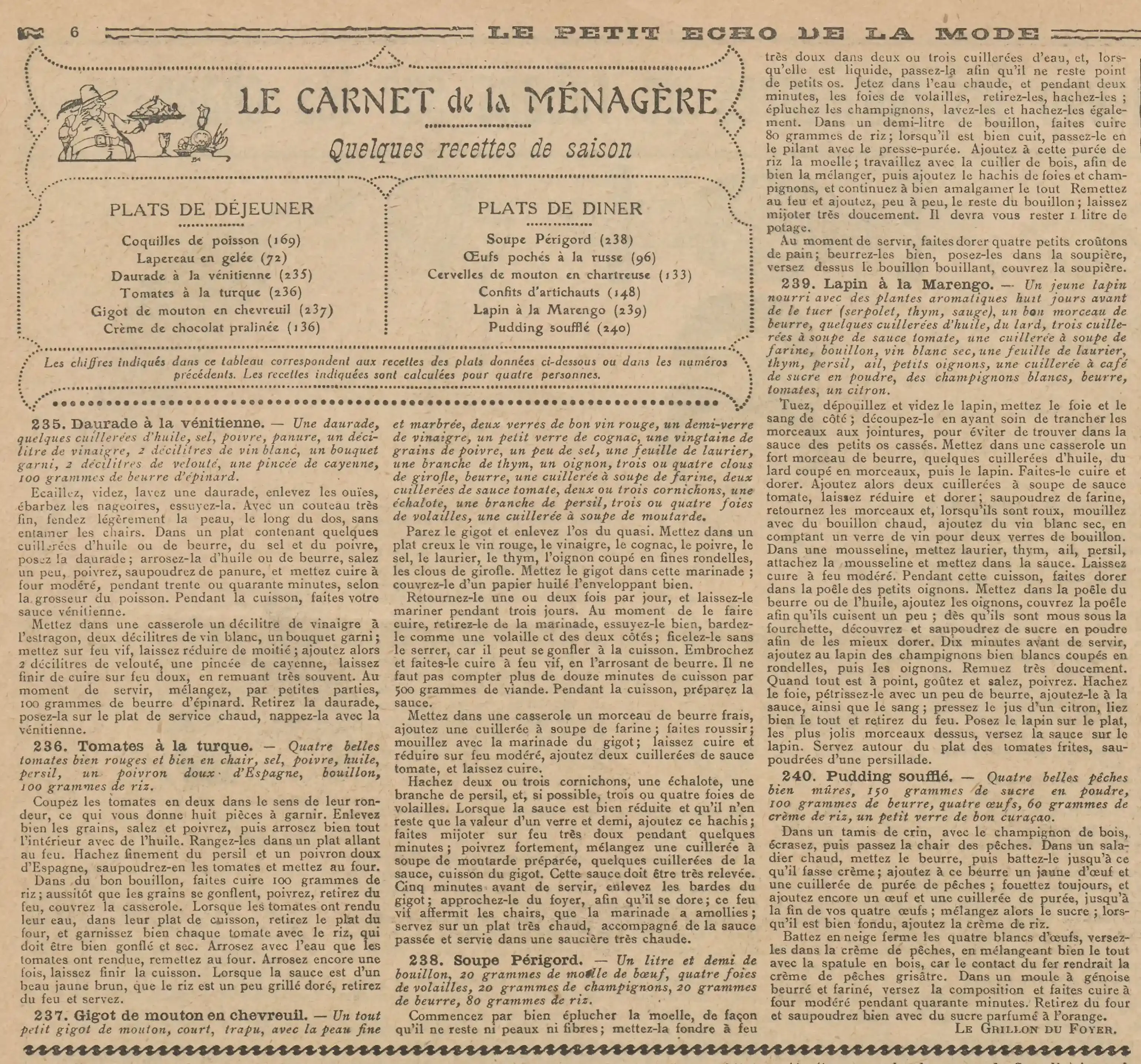 PLATS DE DÉJEUNER Coquilles de poisson (169) PLATS DE DINER Soupe Périgord (238) 235. Daurade à la vénitienne. Une daurade, quelques cuillerées d'huile, sel, poivre, panure, un décilitre de vinaigre, 2 décilitres de vin blanc, un bouquet garni, 2 décilitres de velouté, une pincée de cayenne, 100 grammes de beurre d'épinard. Mettez dans une casserole un décilitre de vinaigre à l'estragon, deux décilitres de vin blanc, un bouquet garni; mettez sur feu vif, laissez réduire de moitié, ajoutez alors 2 décilitres de velouté, une pincée de cayenne, laissez finir de cuire sur feu doux, en remuant très souvent. Au moment de servir, mélangez, par petites parties, 100 grammes de beurre d'épinard. Retirez la daurade, posez-la sur le plat de service chaud, nappez-la avec la vénitienne. 236. Tomates à la turque. Quatre belles tomates bien rouges et bien en chair, sel, poivre, huile, persil, un poivron doux d'Espagne, bouillon, 100 grammes de riz. 237. Gigot de mouton en chevreuil. Un tout petit gigot de mouton, court, trapu, avec la peau fine et marbrée, deux verres de bon vin rouge, un demi-verre de vinaigre, un petit verre de cognac, une vingtaine de grains de poivre, un peu de sel, une feuille de laurier, une branche de thym, un oignon, trois ou quatre clous de girofle, beurre, une cuillerée à soupe de farine, deux cuillerées de sauce tomate, deux ou trois cornichons, une échalote, une branche de persil, trois ou quatre foies de volailles, une cuillerée à soupe de moutarde. Parez le gigot et enlevez l'os du quasi. Mettez dans un plat creux le vin rouge, le vinaigre, le cognac, le poivre, le sel, le laurier, le thym, l'oignon coupé en fines rondelles, les clous de girofle. Mettez le gigot dans cette marinade; couvrez-le d'un papier huilé l'enveloppant bien. Retournez-le une ou deux fois par jour, et laissez-le mariner pendant trois jours. Au moment de le faire cuire, retirez-le de la marinade, essuyez-le bien, bardez- le comme une volaille ct des deux côtés; ficelez-le sans le serrer, car il peut se gonfler à la cuisson. Embrochez et faites-le cuire à feu vif, en l'arrosant de beurre. Il ne faut pas compter plus de douze minutes de cuisson par 500 grammes de viande. Pendant la cuisson, préparez la sauce. Mettez dans une casserole un morceau de beurre frais, ajoutez une cuillerée à soupe de farine; faites roussir; mouillez avec la marinade du gigot; laissez cuire et réduire sur feu modéré, ajoutez deux cuillerées de sauce tomate, et laissez cuire. Hachez deux ou trois cornichons, une échalote, une branche de persil, et, si possible, trois ou quatre foies de volailles. Lorsque la sauce est bien réduite et qu'il n'en reste que la valeur d'un verre et demi, ajoutez ce hachis; faites mijoter sur feu très doux pendant quelques minutes; poivrez fortement, mélangez une cuillerée à soupe de moutarde préparée, quelques cuillerées de la sauce, cuisson du gigot. Cette sauce doit être très relevée. Cinq minutes avant de servir, enlevez les bardes du gigot; approchez-le du foyer, afin qu'il se dore; ce feu. vif affermit les chairs, que la marinade a amollies; servez sur un plat très chaud, accompagné de la sauce passée et servie dans une saucière très chaude. 238. Soupe Périgord. Un litre et demi de bouillon, 20 grammes de moelle de bœuf, quatre foies de volailles, 20 grammes de champignons, 20 grammes de beurre, 80 grammes de riz. Au moment de servir, faites dorer quatre petits croûtons de pain; beurrez-les bien, posez-les dans la soupière, versez dessus le bouillon bouillant, couvrez la soupière. 239. Lapin à la Marengo.. Un jeune lapin nourri avec des plantes aromatiques huit jours avant de le tuer (serpolet, thym, sauge), un bon morceau de beurre, quelques cuillerées d'huile, du lard, trois cuillerées à soupe de sauce tomate, une cuillerée à soupe de farine, bouillon, vin blanc sec, une feuille de laurier, thym, persil, ail, petits oignons, une cuillerée à café de sucre en poudre, des champignons blancs, beurre, tomates, un citron. Tuez, dépouillez et videz le lapin, mettez le foie et le sang de côté; découpez-le en ayant soin de trancher les morceaux aux jointures, pour éviter de trouver dans la sauce des petits os cassés. Mettez dans une casserole un fort morceau de beurre, quelques cuillerées d'huile, du lard coupé en morceaux, puis le lapin. Faites-le cuire et dorer. Ajoutez alors deux cuillerées à soupe de sauce tomate, laissez réduire et dorer; saupoudrez de farine, retournez les morceaux et, lorsqu'ils sont roux, mouillez avec du bouillon chaud, ajoutez du vin blanc sec, en comptant un verre de vin pour deux verres de bouillon. Dans une mousseline, mettez laurier, thym, ail, persil, attachez la mousseline et mettez dans la sauce. Laissez cuire à feu modéré. Pendant cette cuisson, faites dorer dans la poêle des petits oignons. Mettez dans la poêle du beurre ou de l'huile, ajoutez les oignons, couvrez la poêle afin qu'ils cuisent un peu ; dès qu'ils sont mous sous la fourchette, découvrez et saupoudrez de sucre en poudre afin de les mieux dorer. Dix minutes avant de servir, ajoutez au lapin des champignons bien blancs coupés en rondelles, puis les oignons. Remuez très doucement. Quand tout est à point, goûtez et salez, poivrez. Hachez le foie, pétrissez-le avec un peu de beurre, ajoutez-le à la sauce, ainsi que le sang; pressez le jus d'un citron, liez bien le tout et retirez du feu. Posez le lapin sur le plat, les plus jolis morceaux dessus, versez la sauce sur le lapin. Servez autour du plat des tomates frites, saupoudrées d'une persillade. 240. Pudding soufflé. Quatre belles pêches bien mûres, 150 grammes de sucre en poudre, 100 grammes de beurre, quatre œufs, 60 grammes de crème de riz, un petit verre de bon curaçao. Dans un tamis de crin, avec le champignon de bois, écrasez, puis passez la chair des pêches. Dans un saladier chaud, mettez le beurre, puis battez-le jusqu'à ce qu'il fasse crèm
