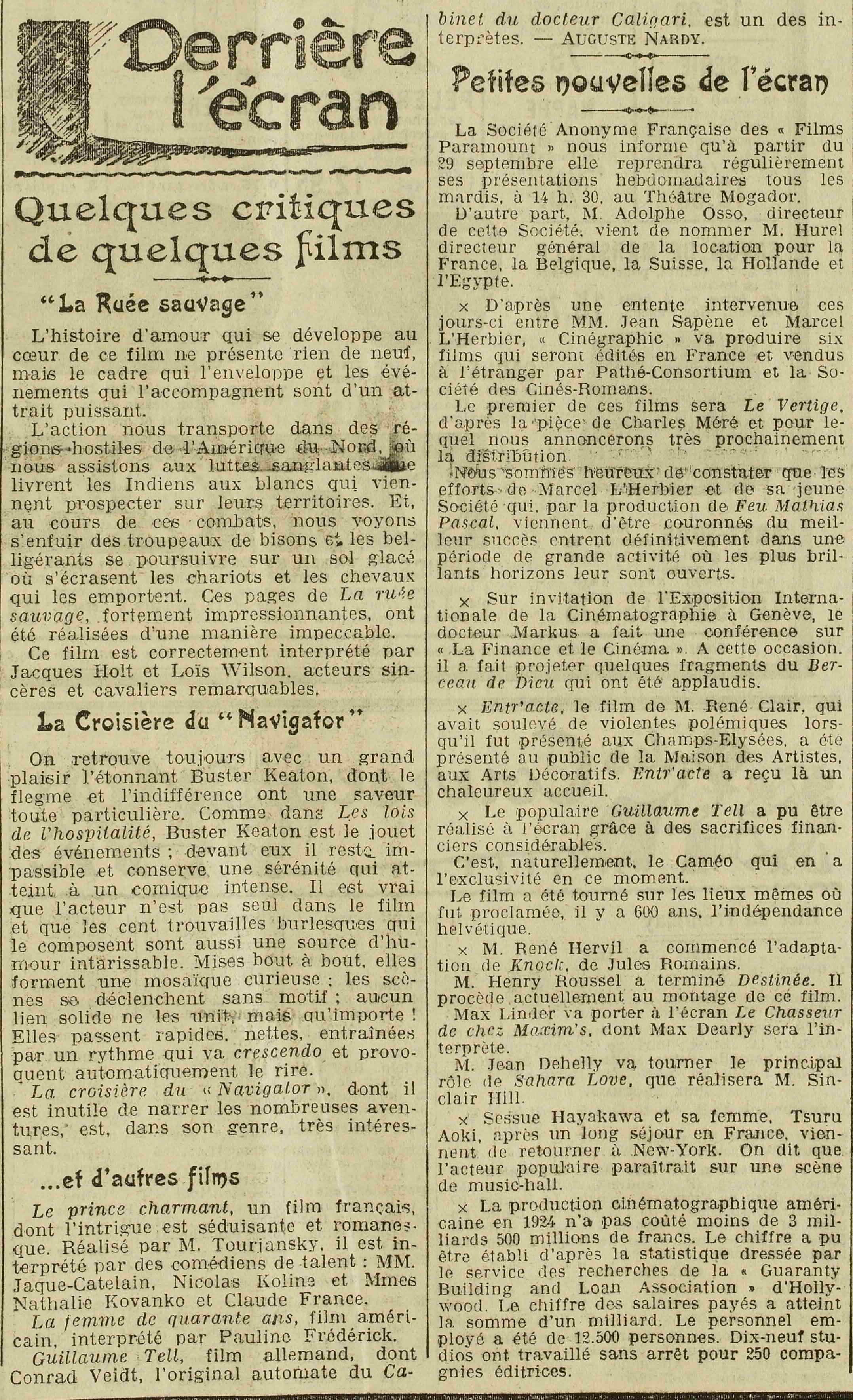 "La femme de quarante ans", film américain, interprété par Pauline Frédérick. "Guillaume Tell", film allemand, dont Conrad Veidt, l'original automate du "Cabinet du docteur Caligari", est un des interprètes.