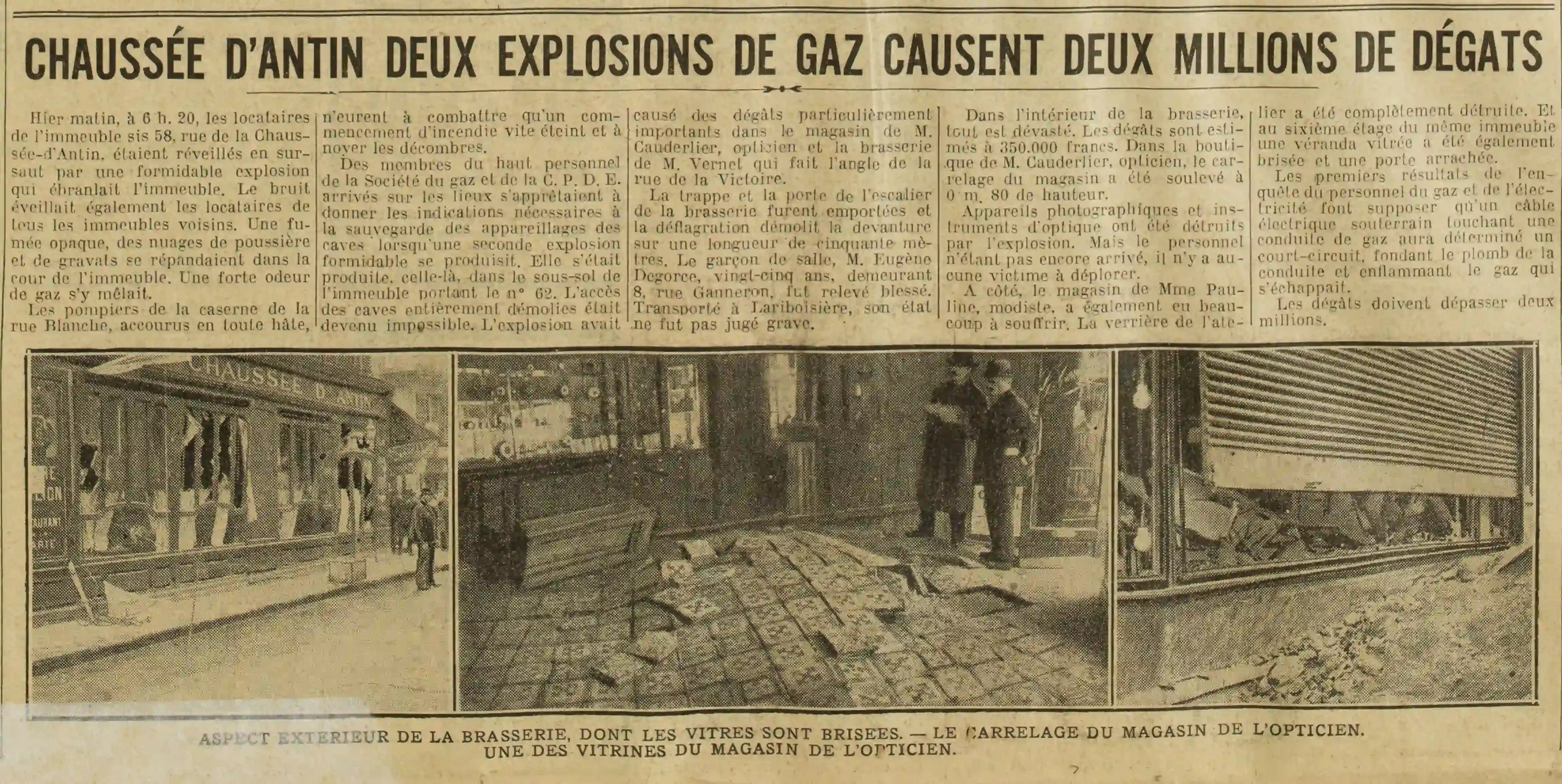 Yesterday morning, at 6:20 a.m., the tenants of the building located at 58, rue de la Chaussée-d'Antin, were awakened with a start by a tremendous explosion that shook the building. The noise also woke the tenants of all the neighboring buildings. Opaque smoke, clouds of dust and rubble spread across the courtyard of the building. A strong smell of gas mingled with it. The firefighters from the barracks on rue Blanche, who rushed to the scene in all haste, only had to fight the beginnings of a fire that was quickly extinguished and drown the rubble. Members of the senior staff of the Gas Company and the C.P.D.E. who arrived on the scene were preparing to give the necessary instructions to save the equipment in the cellars when a second tremendous explosion occurred. This one happened in the basement of the building numbered 62. Access to the completely demolished cellars had become impossible. The explosion caused particularly significant damage to the shop of Mr. Cauderlier, optician, and the brasserie of Mr. Vernet, which is on the corner of Rue de la Victoire. Inside the brasserie, everything was devastated. The damage is estimated at 350,000 francs. In the shop of Mr. Cauderlier, optician, the tiles of the store were lifted to a height of 0.80 m. Next door, the shop of Mrs. Pauline, a milliner, also suffered greatly. The glass roof of the workshop was completely destroyed. And on the sixth floor of the same building a glass veranda was also broken and a door torn off. The first results of the investigation by the gas and electricity staff suggest that an underground electrical cable touching a gas pipe caused a short circuit, melting the lead in the pipe and igniting the escaping gas. The damage must exceed two million. In photos EXTERIOR APPEARANCE OF THE BRASSERIE, WHOSE WINDOWS ARE BROKEN. THE TILES OF THE OPTICIAN'S SHOP, ONE OF THE WINDOWS OF THE OPTICIAN'S SHOP. |