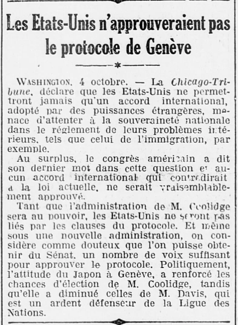 Les États-Unis n'approuveraient pas le protocole de Genève WASHINGTON, 4 octobre. La Chicago-Tribune, déclare que les États-Unis ne permettront jamais qu'un accord international, adopté par des puissances étrangères, menace d'attenter à la souveraineté nationale dans le règlement de leurs problèmes intérieurs, tels que celui de l'immigration, par exemple. Au surplus, le congrès américain a dit son dernier mot dans cette question et aucun accord international qui contredirait a la loi actuelle, ne serait vraisemblablement approuvé. Tant que l'administration de M. Coolidge sera au pouvoir, les États-Unis ne seront pas liés par les clauses du protocole. Et même sous une nouvelle administration, on considère comme douteux que l'on puisse obtenir du Sénat, un nombre de voix suffisant pour approuver le protocole. Politiquement, l'attitude du Japon à Genève, a renforcé les chances d'élection de M. Coolidge, tandis qu'elle a diminué celles de M. Davis, qui est un ardent défenseur de la Ligue des Nations. |