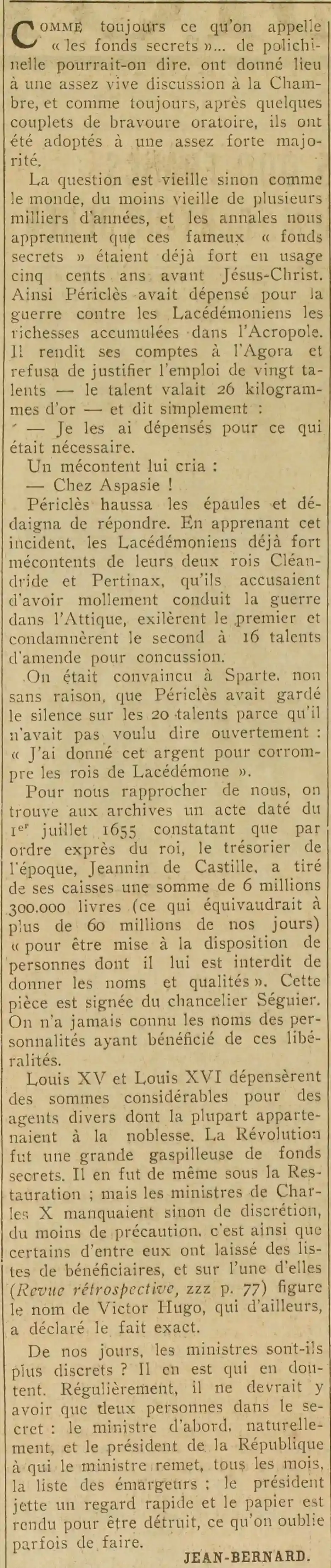 As always, what are called "secret funds"... one might say, open-ended. gave rise to a fairly lively discussion in the House, and as always, after a few verses of oratorical bravado, they were adopted by a fairly large majority. The question is as old as the world, if not as old as the world, at least several thousand years old, and the annals tell us that these famous "secret funds" were already in great use five hundred years before Jesus Christ. Thus Pericles had spent the wealth accumulated in the Acropolis on the war against the Lacedaemonians. He gave his accounts to the Agora and refused to justify the use of twenty talents - the talent was worth 26 kilograms of gold - and simply said: To bring us closer to us, we find in the archives a document dated July 1, 1655 stating that by express order of the king, the treasurer of the time, Jeannin of Castile, drew from his coffers a sum of 6,300,000 livres (which would be equivalent to more than 60 million today) "to be placed at the disposal of people whose names and qualities he is forbidden to give". This document is signed by Chancellor Séguier. The names of the personalities who benefited from these generosity have never been known. Are ministers more discreet these days? Some doubt it. Regularly, there should only be two people in the secret, the minister first, naturally, and the President of the Republic to whom the minister gives, every month, the list of signatories; the President takes a quick look and the paper is returned to be destroyed, which is sometimes forgotten. JEAN-BERNARD . |