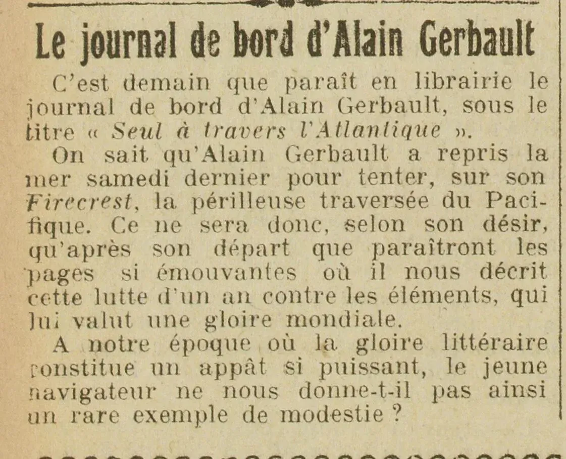 On sait qu'Alain Gerbault a repris la mer samedi dernier pour tenter, sur son Firecrest, la périlleuse traversée du Pacifique. Ce ne sera donc, selon son désir, qu'après son départ que paraîtront les pages si émouvantes où il nous décrit cette lutte d'un an contre les éléments, qui Jui valut une gloire mondiale. A notre époque où la gloire littéraire constitue un appât si puissant, le jeune navigateur ne nous donne-t-il pas ainsi un rare exemple de modestie ? |