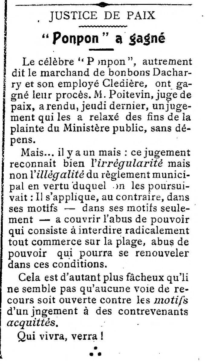 Le célèbre "Ponpon", autrement dit le marchand de bonbons Dacharry et son employé Cledière, ont gagné leur procès. M. Poitevin, juge de paix, a rendu, jeudi dernier, un jugement qui les a relaxé des fins de la plainte du Ministère public, sans dépens. Mais... il y a un mais: ce jugement reconnaît bien l'irrégularité mais non l'illégalité du règlement municipal en vertu duquel on les poursuivait: Il s'applique, au contraire, dans ses motifs dans ses motifs seulement à couvrir l'abus de pouvoir qui consiste à interdire radicalement tout commerce sur la plage, abus de pouvoir qui pourra se renouveler dans ces conditions. Cela est d'autant plus fâcheux qu❜li ne semble pas qu'aucune voie de recours soit ouverte contre les motifs d'un jugement à des contrevenants acquittés. Qui vivra, verra!