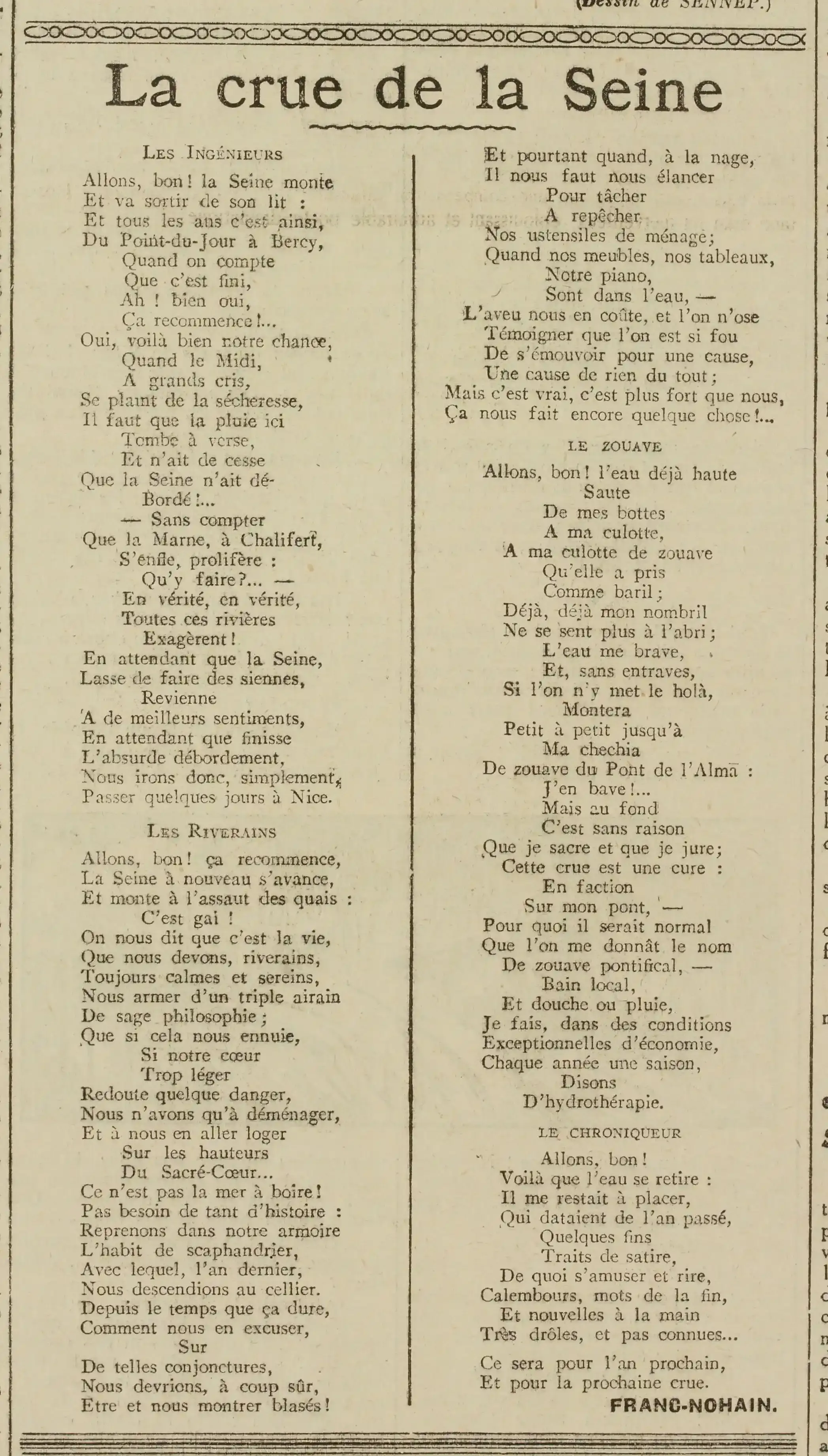 Allons, bon! la Seine monte Et va sortir de son lit: Et tous les ans c'est ainsi, Du Point-du-Jour à Bercy, Quand on compte Que c'est fini, A h! bien oui, Ça recommence !...
