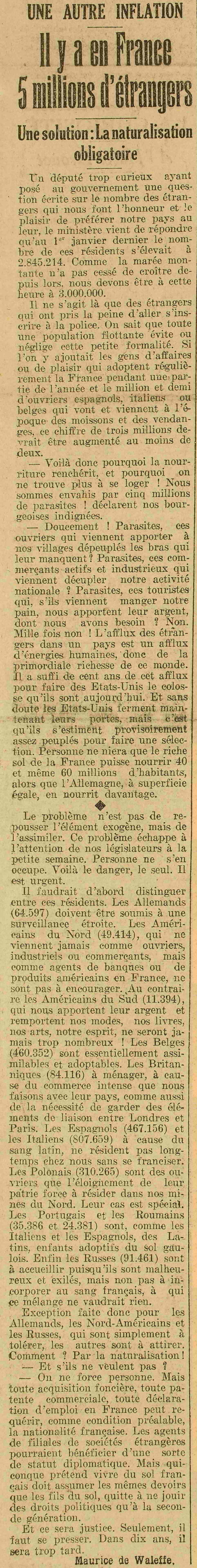 Il faudrait d'abord distinguer entre ces résidents. Les Allemands (64.597) doivent être soumis à une surveillance étroite. Les Américains du Nord (49.414), qui ne viennent jamais comme ouvriers, industriels ou commerçants, mais comme agents de banques ou de produits américains en France, ne sont pas à encourager. Au contraire les Américains du Sud (11.394), qui nous apportent leur argent et remportent nos modes, nos livres, nos arts, notre esprit, ne seront jamais trop nombreux ! Les Belges (460.352) sont essentiellement assimilables et adoptables. Les Britanniques (84.116) à ménager, à cause du commerce intense que nous faisons avec leur pays, comme aussi de la nécessité de garder des éléments de liaison entre Londres et Paris. Les Espagnols (467.156) et les Italiens (807.659) à cause du sang latin, ne résident pas longtemps chez nous sans se franciser. Les Polonais (310.265) sont des ouvriers que l'éloignement de leur patrie force à résider dans nos mines du Nord. Leur cas est spécial. Les Portugais et les Roumains (35.386 et 24.381) sont, comme les Italiens et les Espagnols, des Latins, enfants adoptifs du sol gaulois. Enfin les Russes (91.461) sont à accueillir puisqu'ils sont malheureux et exilés, mais non pas à incorporer au sang français, à qui ce mélange ne vaudrait rien. Exception faite donc pour les Allemands, les Nord-Américains et les Russes, qui sont simplement à tolérer, les autres sont à attirer. Comment? Par la naturalisation!