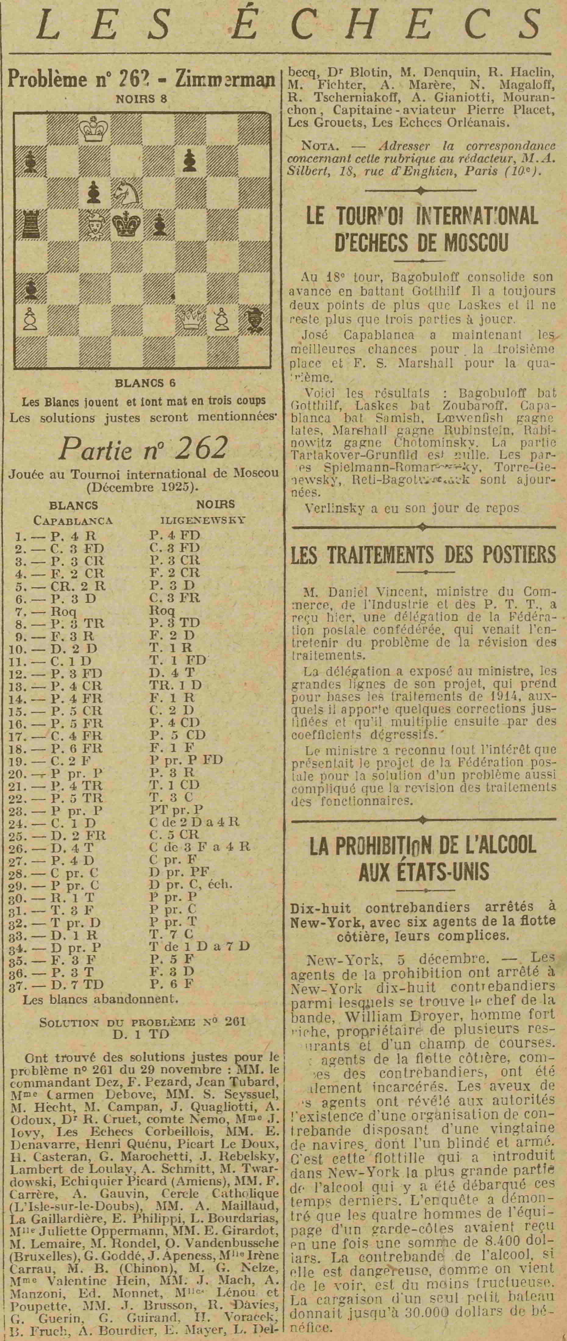 La partie d'échecs hebdomadaire, cette semaine la partie n° 262 - 06 décembre 1925