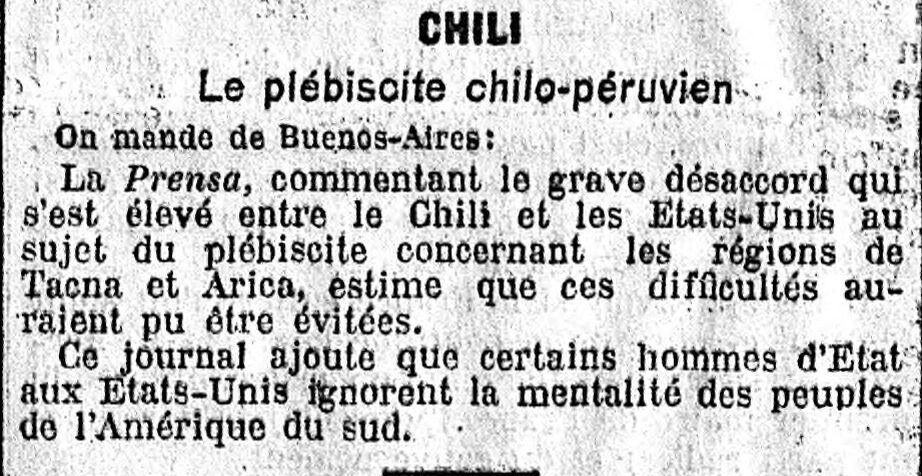La Prensa, commentant le grave désaccord qui s'est élevé entre le Chili et les Etats-Unis au sujet du plébiscite concernant les régions de Tacna et Arica, estime que ces difficultés auraient pu être évitées.