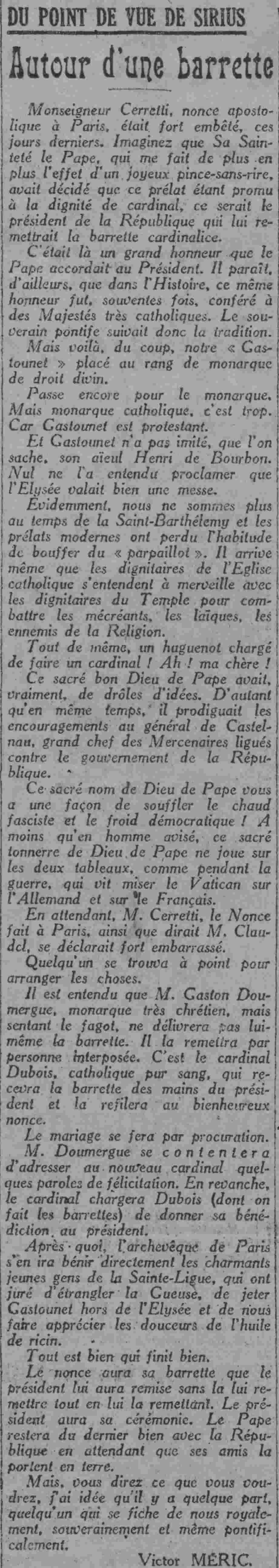 Il est entendu que M. Gaston Doumergue, monarque très chrétien, mais sentant le fagot, ne délivrera pas lui-même la barrette. Il la remettra par personne interposée. C'est le cardinal Dubois, catholique pur sang, qui recevra la barrette des mains du président et la refilera au bienheureux nonce.