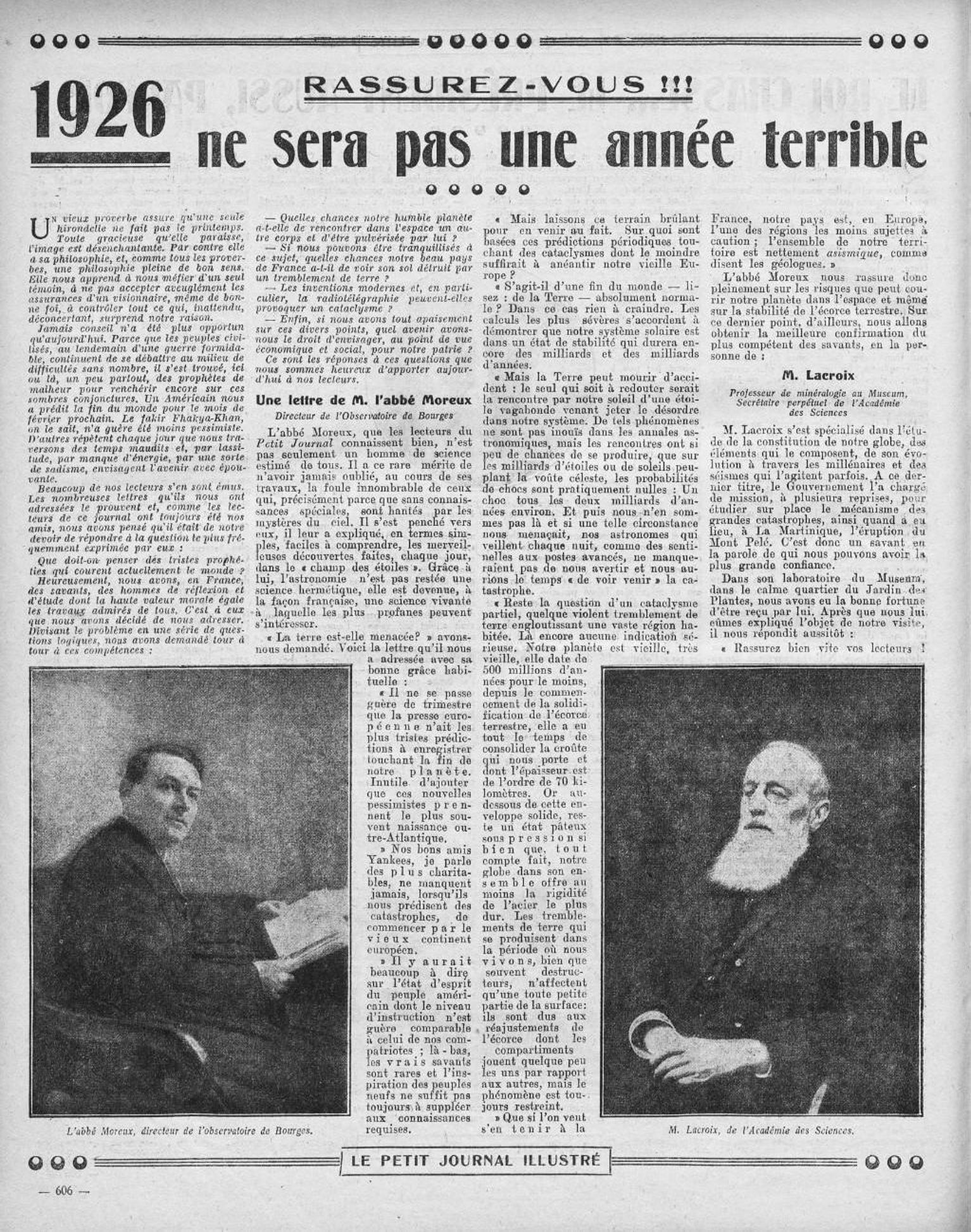 M. Lacroix s'est spécialisé dans l'étude de la constitution de notre globe, éléments qui le composent, de son évolution à travers les millénaires et des séismes qui l'agitent parfois. A ce dernier titre, le Gouvernement l'a chargé de mission, à plusieurs reprises, pour étudier sur place le mécanisme des grandes catastrophes, ainsi quand à eu lieu, à La Martinique, l'éruption du Mont Pelé. C'est donc un savant en la parole de qui nous pouvons avoir la plus grande confiance. Dans son laboratoire du Museum, dans le calme quartier du Jardin des Plantes, nous avons eu la bonne fortune d'être reçu par lui. Après que nous lui. eûmes expliqué l'objet de notre visite, il nous répondit aussitôt :