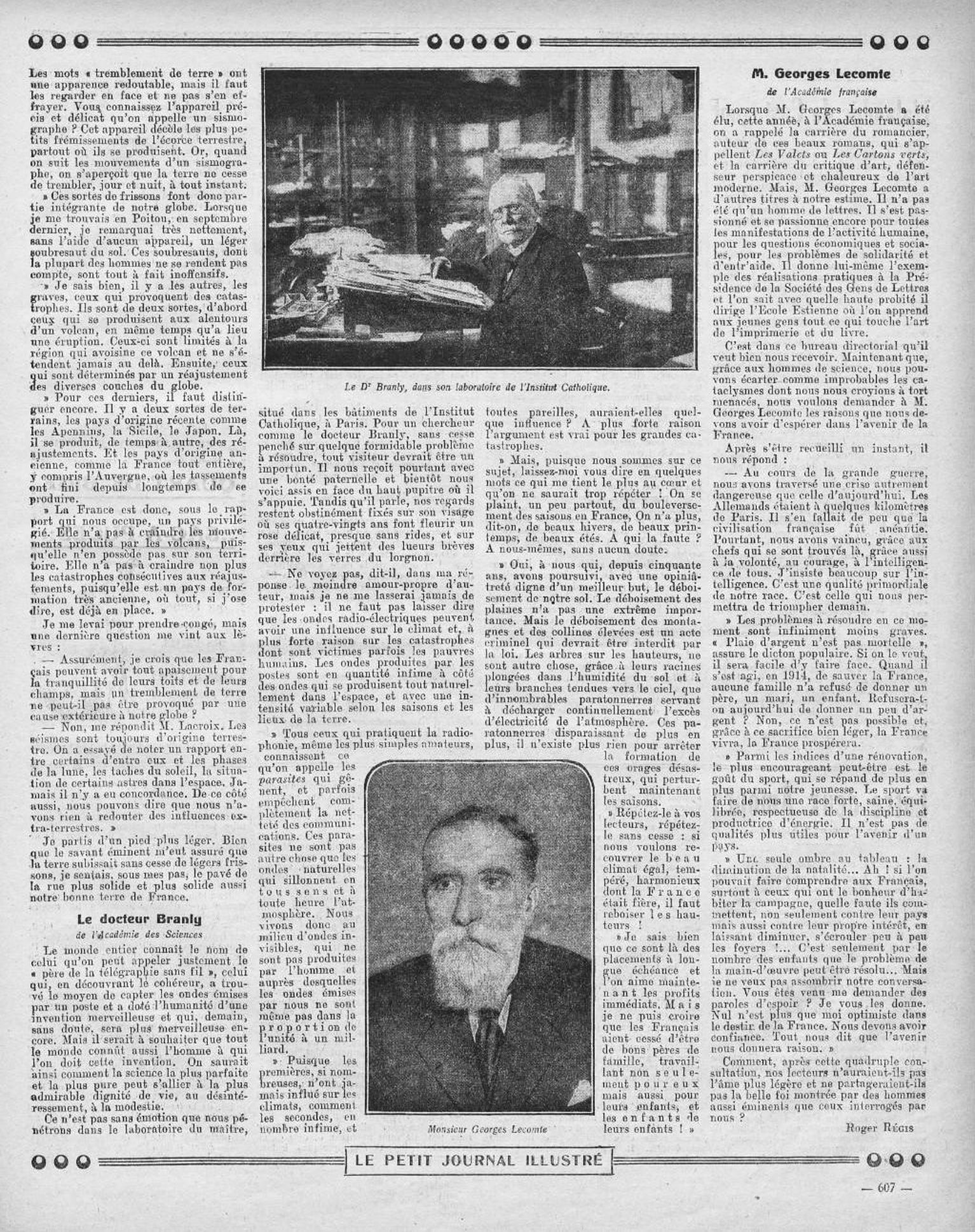 «Rassurez bien vite vos lecteurs ! Les mots «tremblement de terre» ont une apparence redoutable, mais il faut les regarder en face et ne pas s'en effrayer. Vous connaissez l'appareil précis et délicat qu'on appelle un sismographe ? Cet appareil décèle les plus petits frémissements de l'écorce terrestre, partout où ils se produisent. Or, quand on suit les mouvements d'un sismographe, on s'aperçoit que la terre ne cesse de trembler, jour et nuit, à tout instant. Ces sortes de frissons font donc partie intégrante de notre globe. Lorsque je me trouvais en Poitou, en septembre dernier, je remarquai très nettement, sans l'aide d'aucun appareil, un léger soubresaut du sol. Ces soubresauts, dont la plupart des hommes ne se rendent pas compte, sont tout à fait inoffensifs.