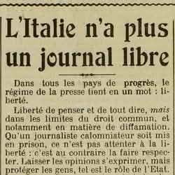 Car voici et c'est là l'important et l'explication, voici venir les débats de l'affaire Matteotti... Garder une presse libre de faire connaître au pays la vérité, de rapporter tout ce qui pourra se dire à l'audience, de reproduire le texte de certaines pièces qui seront peut-être publiées hors d'Italie, c'était courir un gros risque, et M. Mussolini ne l'a pas voulu. Le Sénat vient donc de ratifier (parbleu !) au scrutin secret «le nouveau règlement» de la presse.