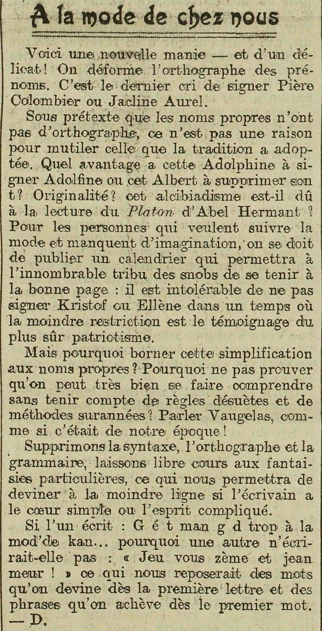 Sous prétexte que les noms propres n'ont pas d'orthographe, ce n'est pas une raison pour mutiler celle que la tradition a adoptée. Quel avantage a cette Adolphine à signer Adolfine ou cet Albert à supprimer son t? Originalité? cet alcibiadisme est-il dû à la lecture du Platon d'Abel Hermant ?