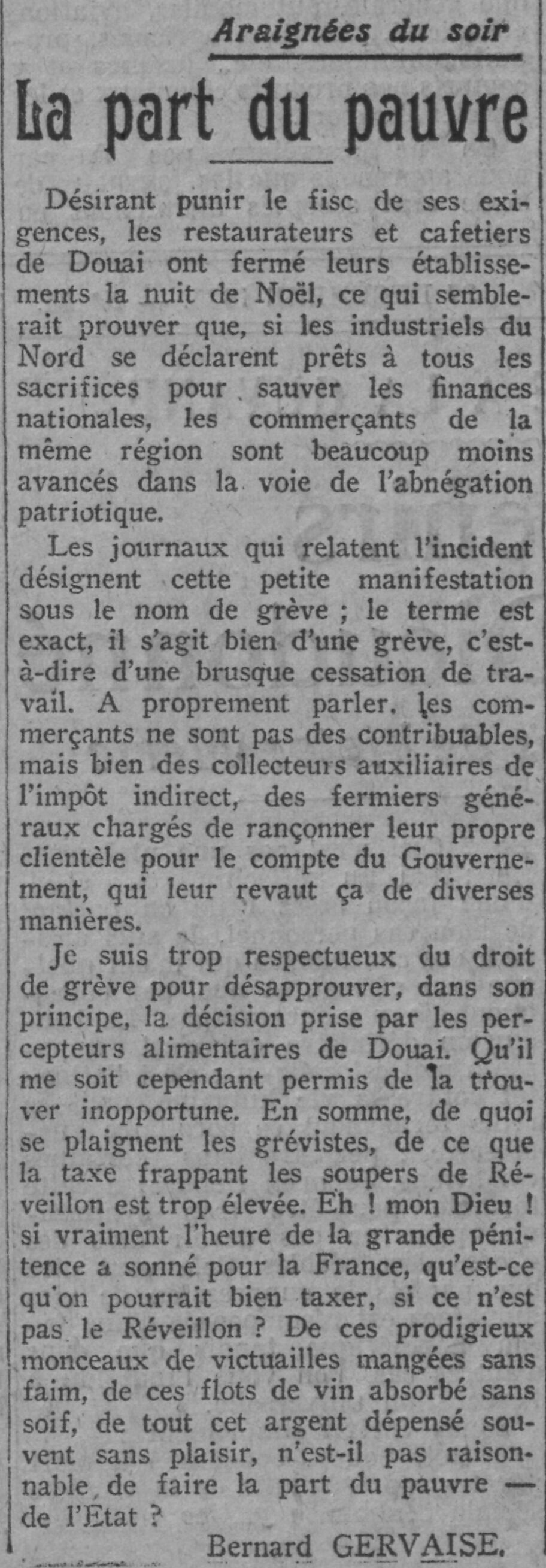 Je suis trop respectueux du droit de grève pour désapprouver, dans son principe, la décision prise par les percepteurs alimentaires de Douai. Qu'il me soit cependant permis de la trouver inopportune. En somme, de quoi se plaignent les grévistes, de ce que la taxe frappant les soupers de Réveillon est trop élevée. Eh ! mon Dieu ! si vraiment l'heure de la grande pénitence a sonné pour la France, qu'est-ce qu'on pourrait bien taxer, si ce n'est pas le Réveillon? De ces prodigieux monceaux de victuailles mangées sans faim, de ces flots de vin absorbé sans soif, de tout cet argent dépensé souvent sans plaisir, n'est-il pas raisonnable, de faire la part du pauvre de l'Etat ?