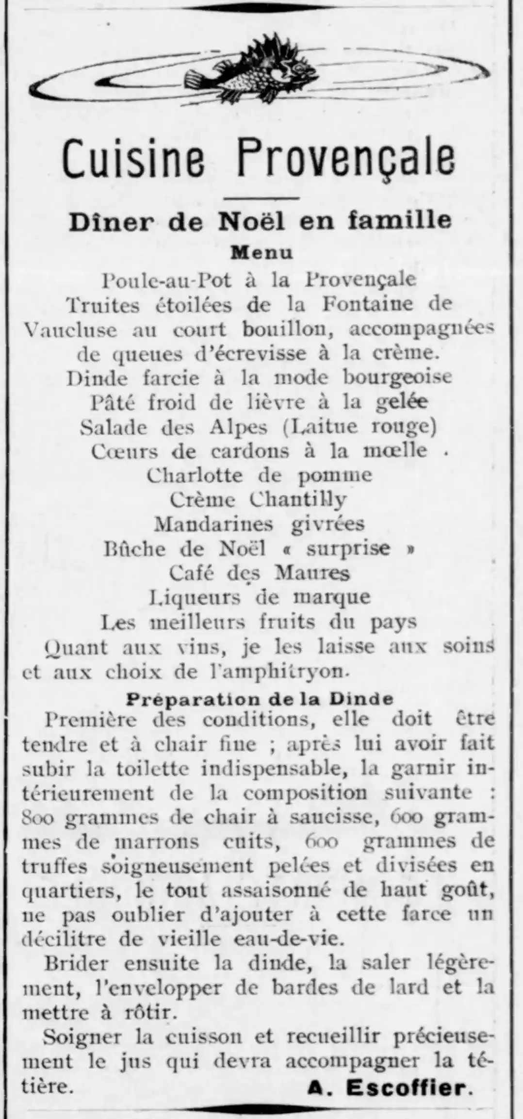 Poule-au-Pot à la Provençale Truites étoilées de la Fontaine de Vaucluse au court bouillon, accompagnées de queues d'écrevisse à la crème. Dinde farcie à la mode bourgeoise Pâté froid de lièvre à la gelée Salade des Alpes (Laitue rouge) Cours de cardons à la molle. Charlotte de pomme Crème Chantilly Mandarines givrées Bûche de Noël surprise » Café des Maures Liqueurs de marque Les meilleurs fruits du pays Quant aux vins, je les laisse aux soins et aux choix de l'amphitryon.