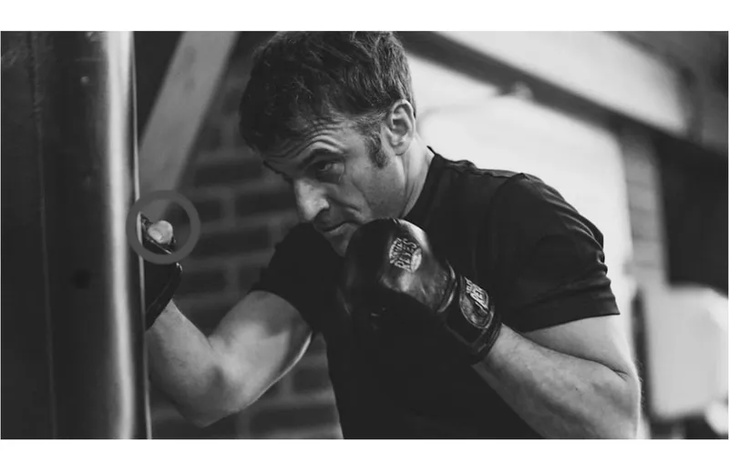 le Président Emmanuel Macron lors d'un entraînement de boxe ? il utiliserait des gant de marque Reyes pouce libre pour sac