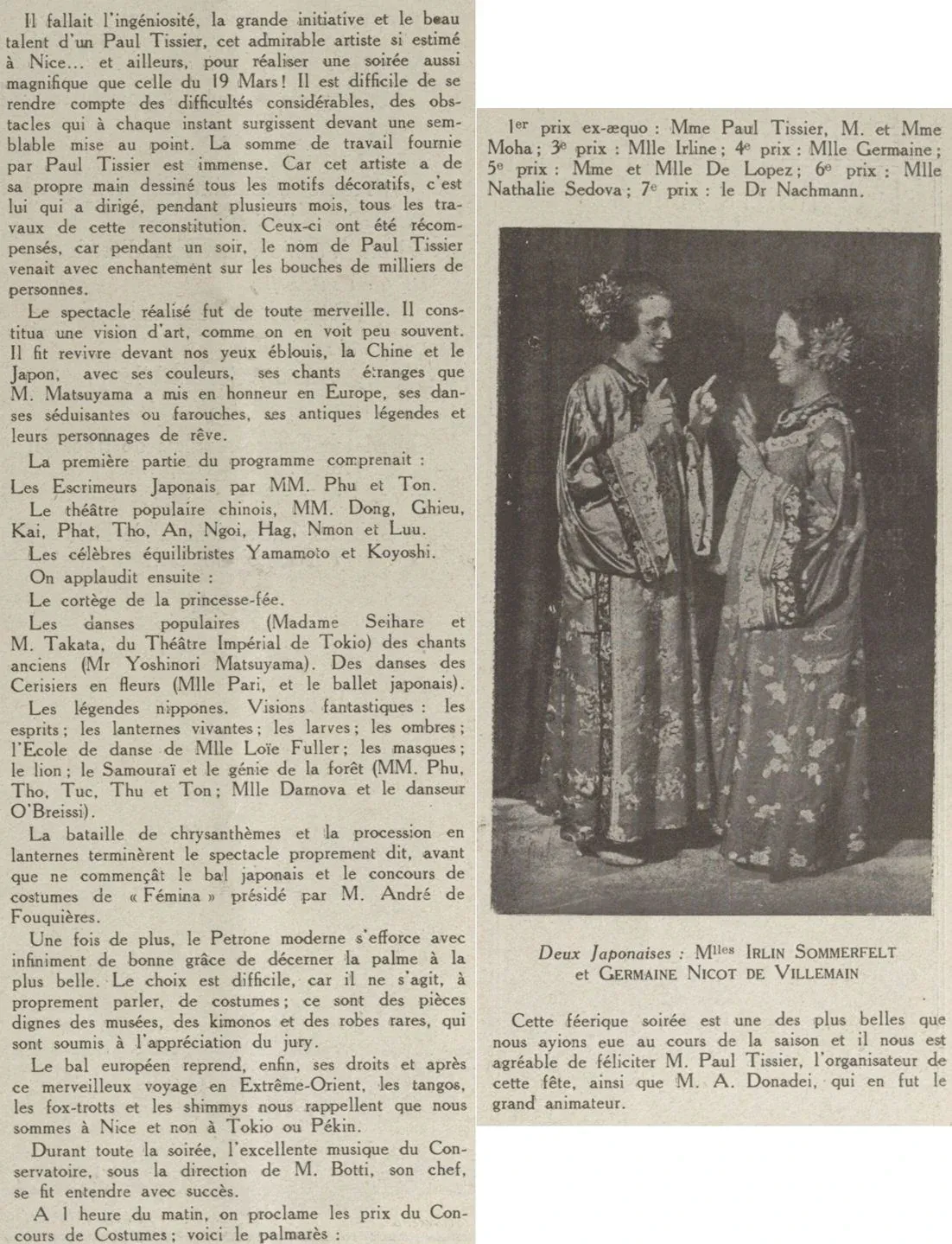 Il fallait l'ingéniosité, la grande initiative et le beau talent d'un Paul Tissier, cet admirable artiste si estimé à Nice... et ailleurs, pour réaliser une soirée aussi magnifique que celle du 19 Mars ! Il est difficile de se rendre compte des difficultés considérables, des obstacles qui à chaque instant surgissent devant une semblable mise au point. La somme de travail fournie par Paul Tissier est immense. Car cet artiste a de sa propre main dessiné tous les motifs décoratifs, c'est lui qui a dirigé, pendant plusieurs mois, tous les travaux de cette reconstitution. Ceux-ci ont été récompensés, car pendant un soir, le nom de Paul Tissier venait avec enchantement sur les bouches de milliers de personnes. Le spectacle réalisé fut de toute merveille. Il constitua une vision d'art, comme on en voit peu souvent. Il fit revivre devant nos yeux éblouis, la Chine et le Japon, avec ses couleurs, ses chants étranges que M. Matsuyama a mis en honneur en Europe, ses danses séduisantes ou farouches, ses antiques légendes et leurs personnages de rêve. La première partie du programme comprenait : Les Escrimeurs Japonais par MM. Phu et Ton. Le théâtre populaire chinois, MM. Dong, Ghieu, Kai, Phat, Tho, An, Ngoi, Hag, Nmon et Luu. Les célèbres équilibristes Yamamoto et Koyoshi. On applaudit ensuite: Le cortège de la princesse-fée, et les danses populaires (Madame Seihare M. Takata, du Théâtre Impérial de Tokio) des chants anciens (Mr Yoshinori Matsuyama). Des danses des Cerisiers en fleurs (Mlle Pari, et le ballet japonais). Les légendes nippones. Visions fantastiques : esprits; les lanternes vivantes; les larves; les ombres; l'Ecole de danse de Mlle Loïe Fuller; les masques; le lion; le Samouraï et le génie de la forêt (MM. Phu, Tho, Tuc, Thu et Ton; Mlle Darnova et le danseur O'Breissi). La bataille de chrysanthèmes et la procession en lanternes terminèrent le spectacle proprement dit, avant que ne commençât le bal japonais et le concours de costumes de « Fémina » présidé par M. André de Fouquières. Une fois de plus, le Petrone moderne s'efforce avec infiniment de bonne grâce de décerner la palme à la plus belle. Le choix est difficile, car il ne s'agit, à proprement parler, de costumes; ce sont des pièces dignes des musées, des kimonos et des robes rares, qui sont soumis à l'appréciation du jury. Le bal européen reprend, enfin, ses droits et après ce merveilleux voyage en Extrême-Orient, les tangos, les fox-trotts et les shimmys nous rappellent que nous sommes à Nice et non à Tokio ou Pékin. Durant toute la soirée, l'excellente musique du Conservatoire, sous la direction de M. Botti, son chef, se fit entendre avec succès. A 1 heure du matin, on proclame les prix du Concours de Costumes; voici le palmarès : Cette féerique soirée est une des plus belles que nous ayions eue au cours de la saison et il nous est agréable de féliciter M. Paul Tissier, l'organisateur de cette fête, ainsi que M. A. Donadei, qui en fut le grand animateur. |